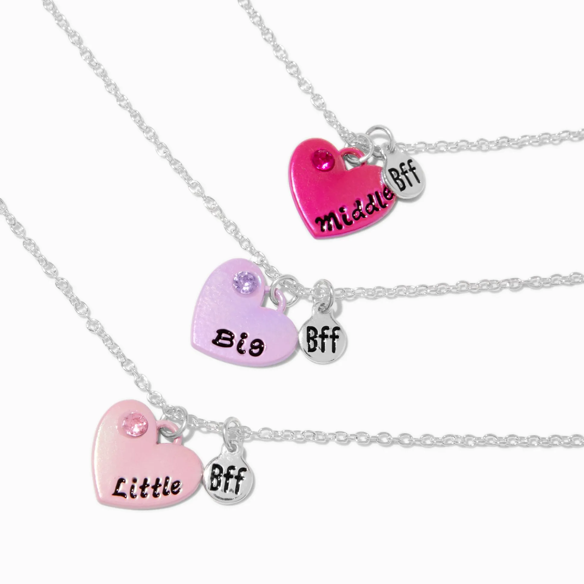 Celebrate sisterhood with this best friends necklace set. The three-pack set includes a blush pink “Little” heart, a purple “Big” heart, and a dark pink “Middle” heart. Each is finished with a “BFF” dangler.