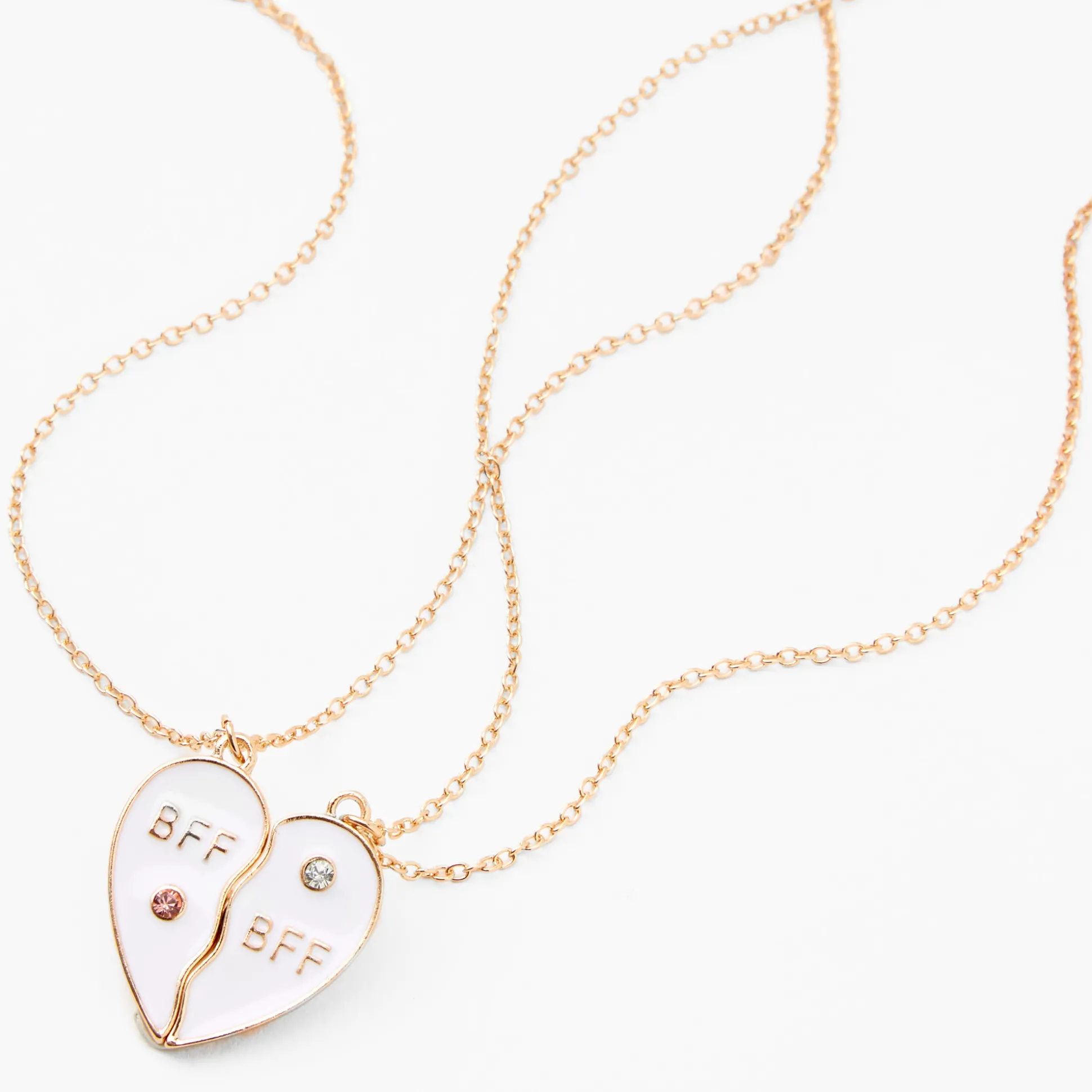 The two of you are “best friends forever,” and the whole world will know it when you wear these coordinating necklaces. The set includes both necklaces, each with one half of a break-apart white heart pendant that reads “BFF.” They’re each adorned with a sparkly faux crystal, and they hang from matching gold-tone chains.