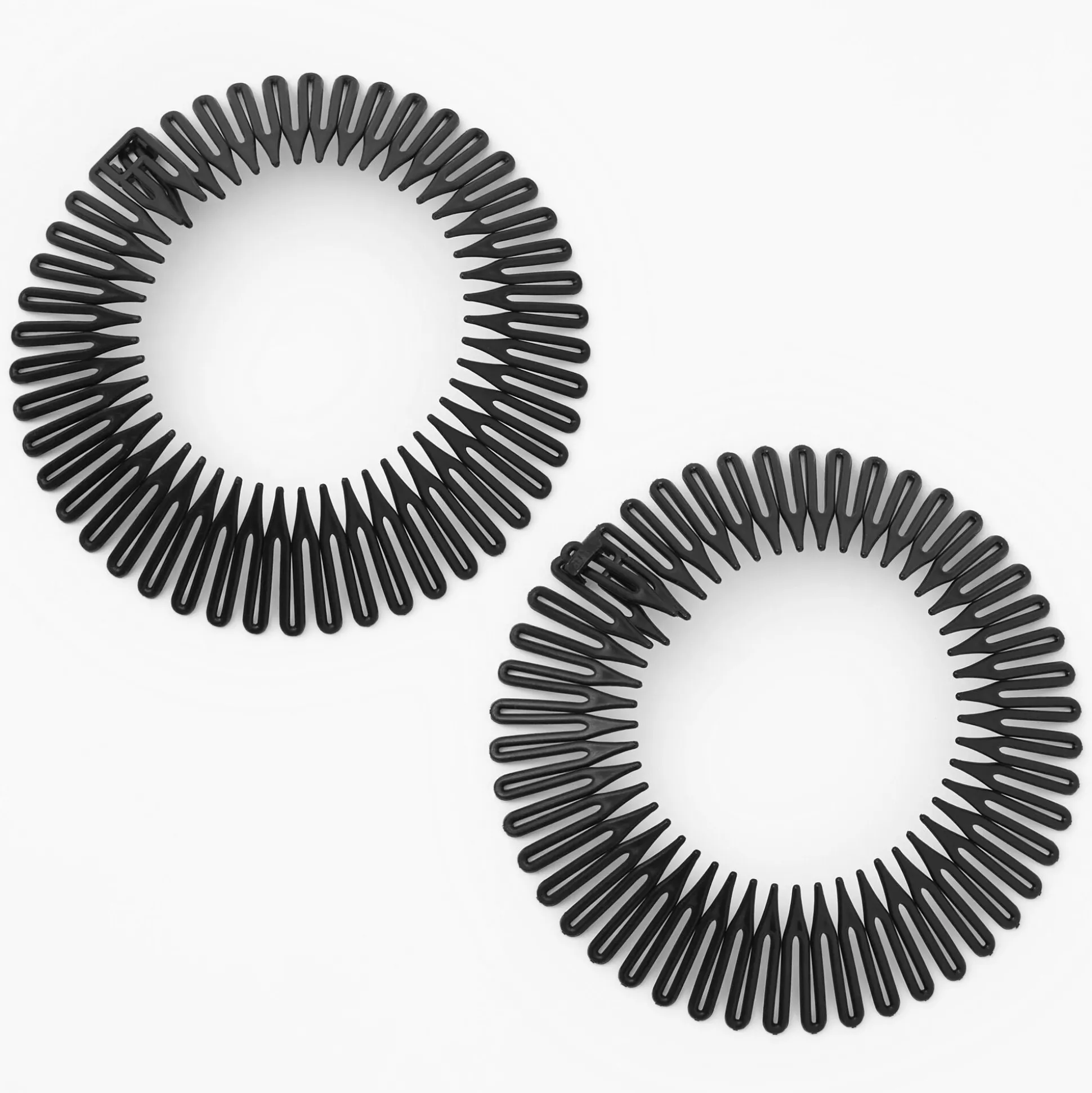 Wear your hair out of your face in style with a comfortable headband! This pack includes two black accordian style headbands that will give your hair the boost it needs by interlocking in the back to secure the hold.