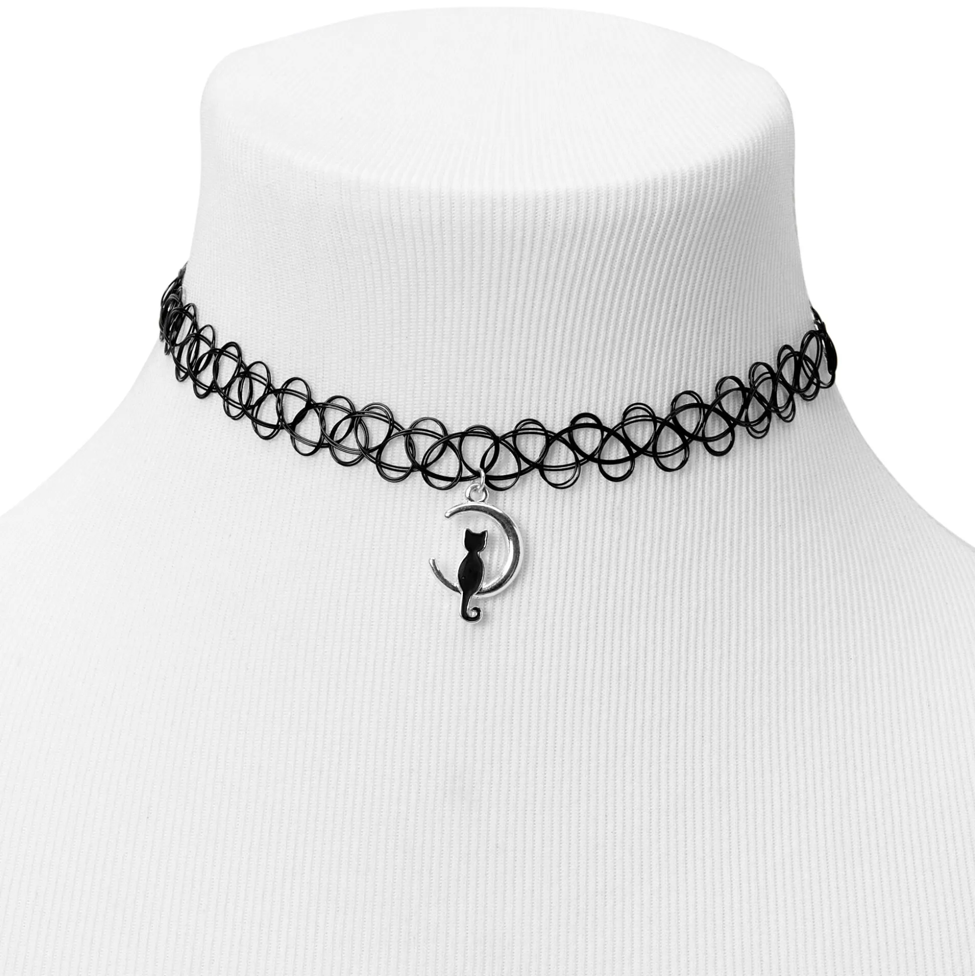 Give any outfit a dark makeover with this edgy, black cat and moon choker necklace! Black, tattoo choker features a black cat and crescent moon mood charm, just-in-time for spooky season.
