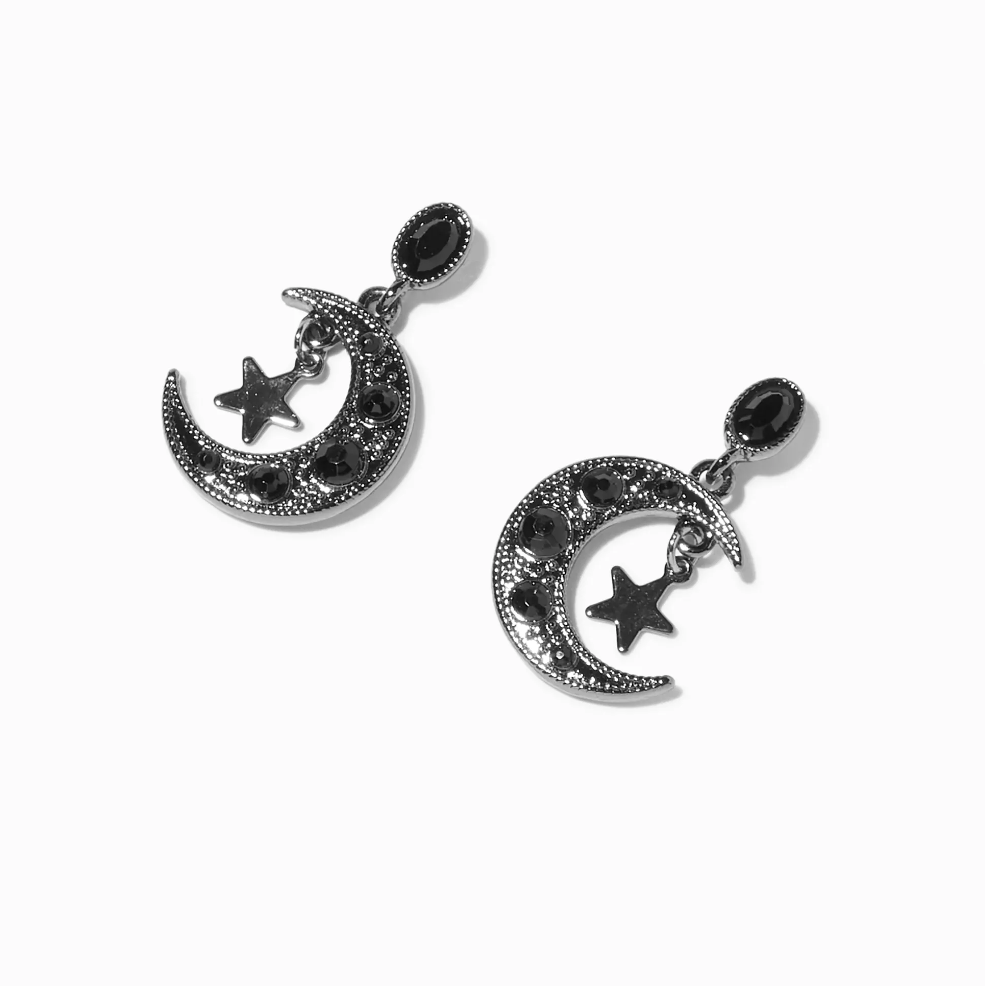If you love celestial themed jewelry, then these earrings are perfect for you! This pair of drop earrings feature large crescent moons with small dangly stars and a cool black-tone.