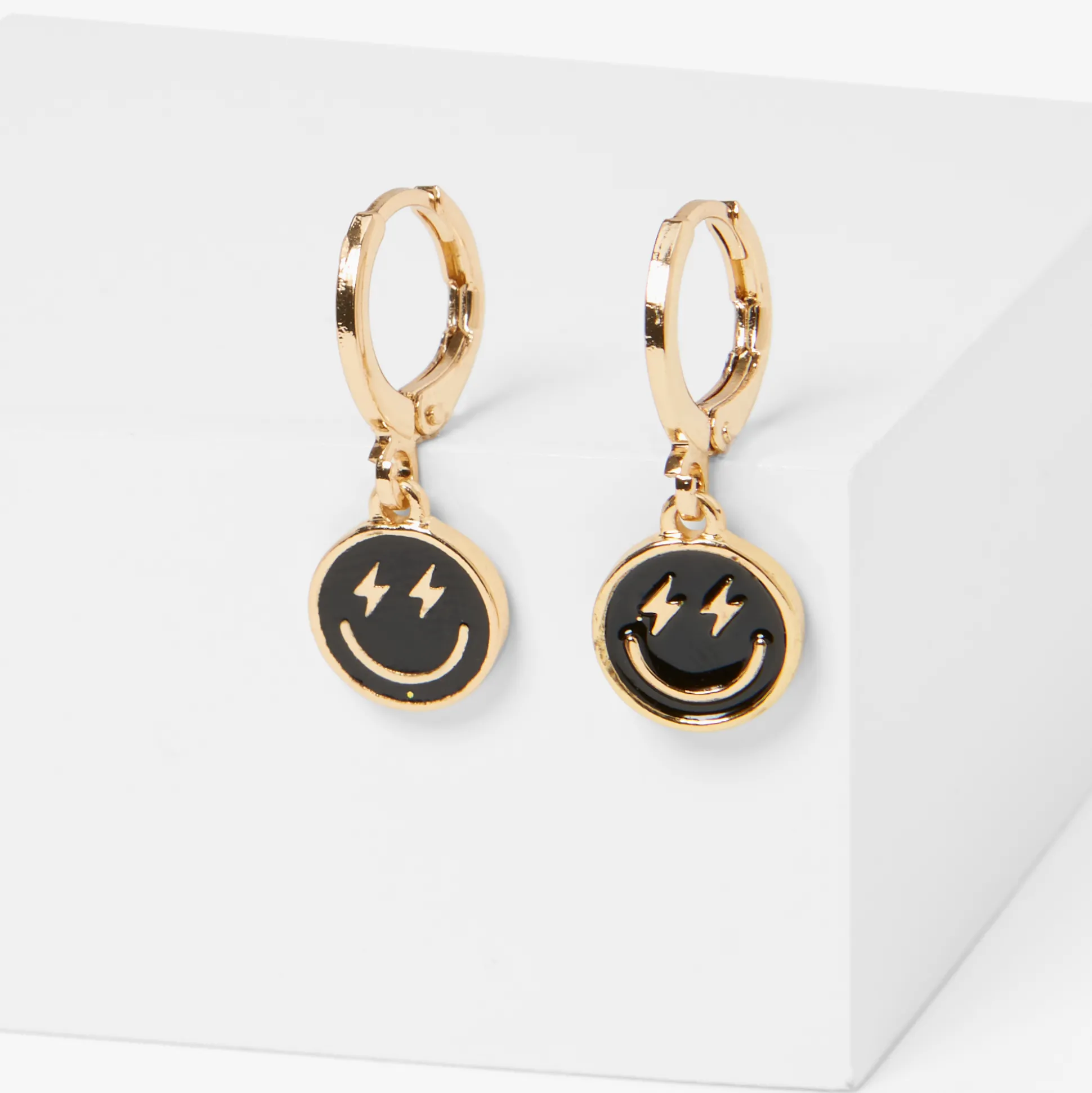 Smile big with these gold-tone hoops. The huggie design securely stays on with a hinge closure and has dangling happy face charms. The smileys have lightning bolt eyes for added power.