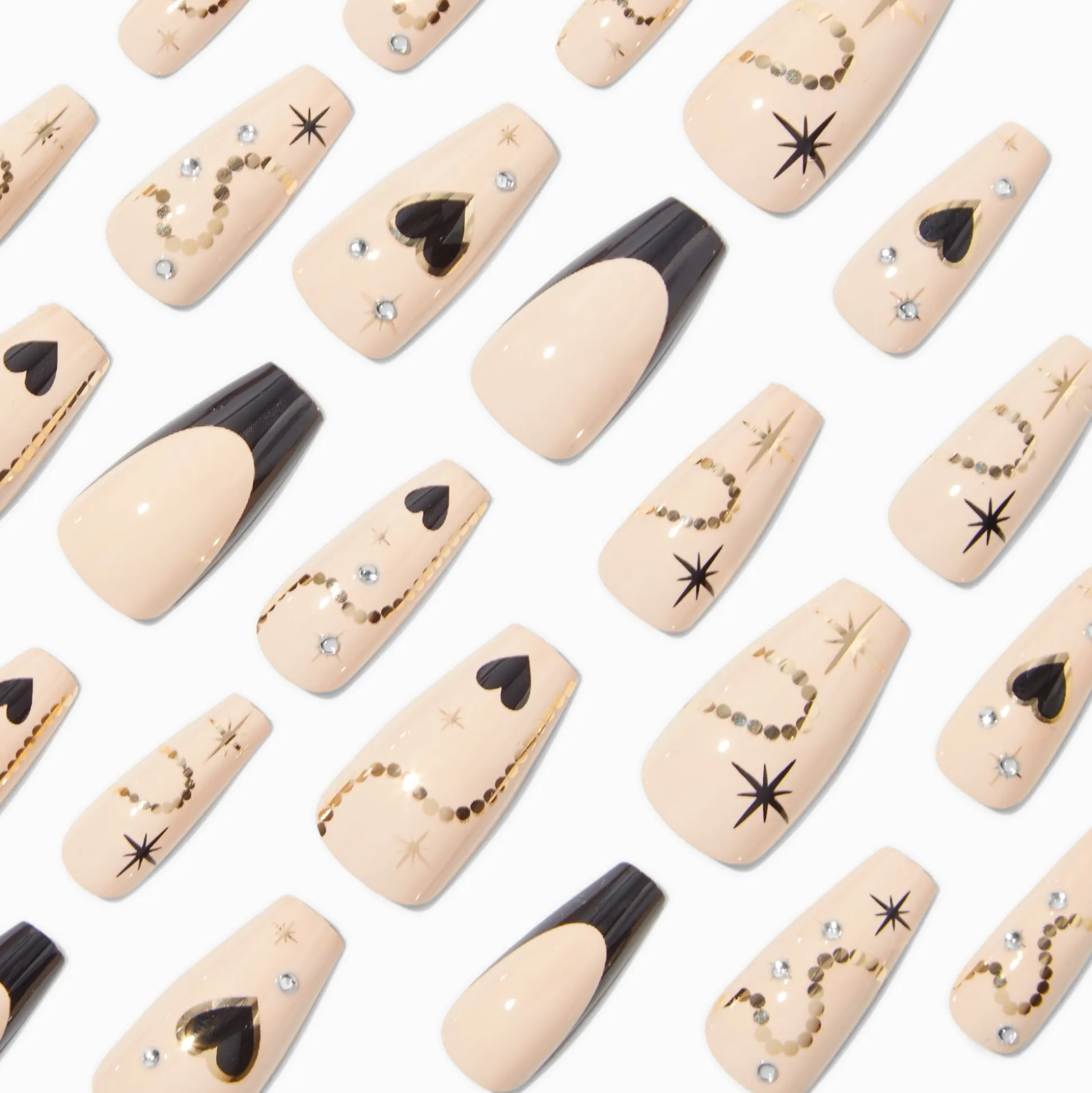 With an improved fit and up to a 7-day wear, these squareletto vegan faux nails are on-trend faves. They come in 12 different sizes, so finding the perfect shaped nail is a breeze. With a squareletto shape, these faux nails have a black heart bling French tip neutral finish.