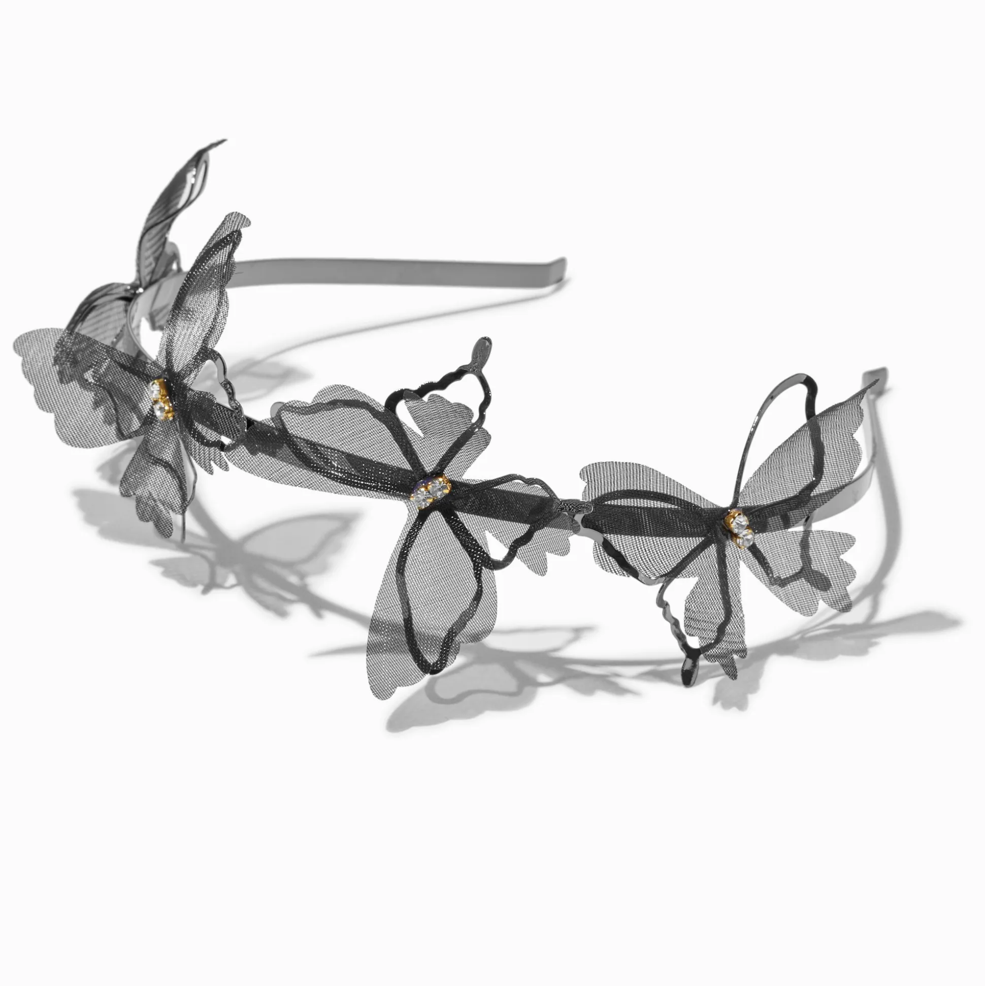 Four lovely butterflies are covered with sheer organza, making it seem like they’re flitting and floating across your hair! They’re attached to a silver-tone double-row metal headband, and each butterfly has faux crystals in the center for a bit of sparkle.