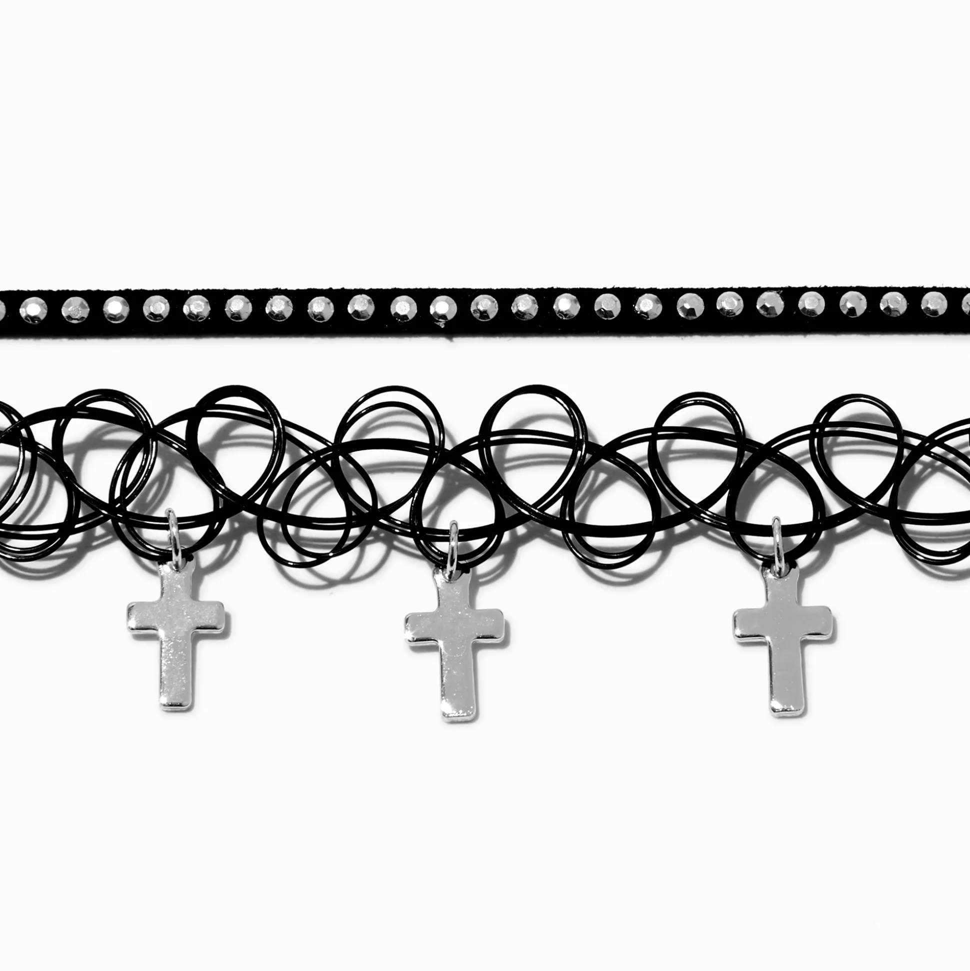 Expand your choker options with this faithful twosome. The two-pack set includes a black ribbon design and a black tattoo-style choker that has dangling silver-tone cross designs.