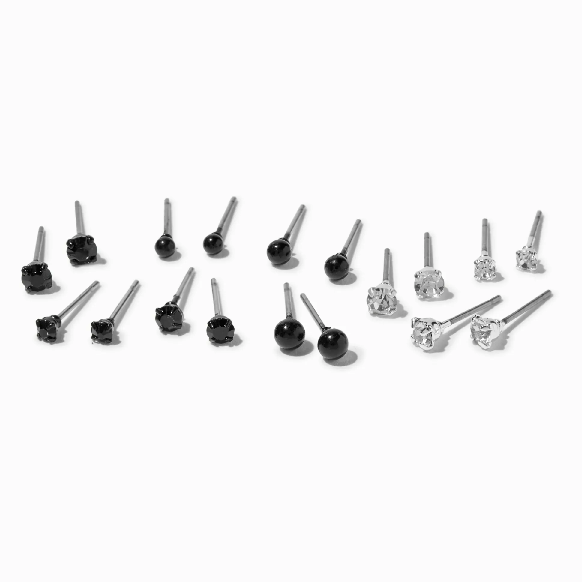 Give your ears classic style with this stud earrings set. It includes black- and silver-tone studs in a variety of shapes and sizes.