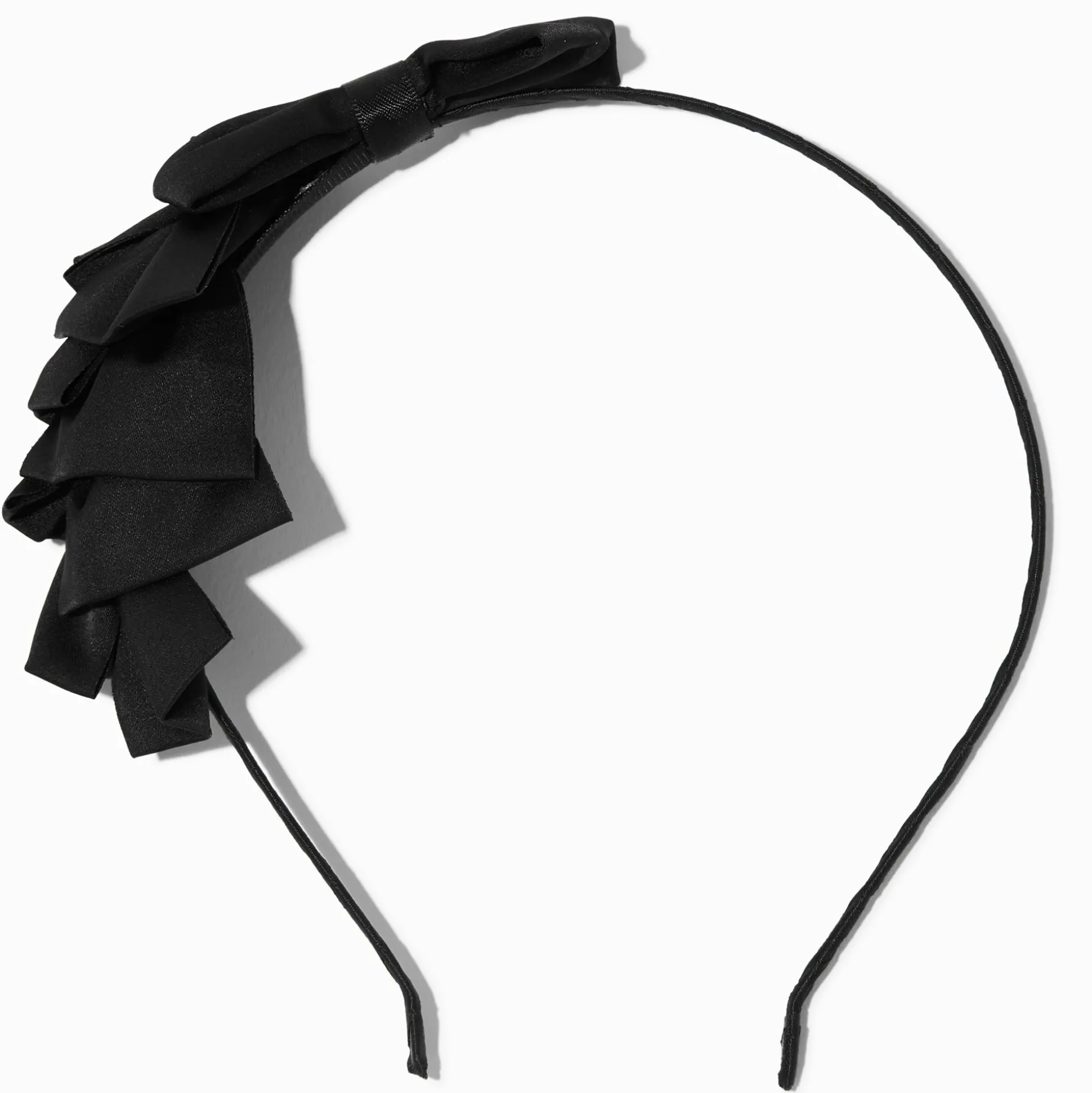Keep your look on fleek and your hair out of your face with this skinny headband. It’s covered in a silky black bow.