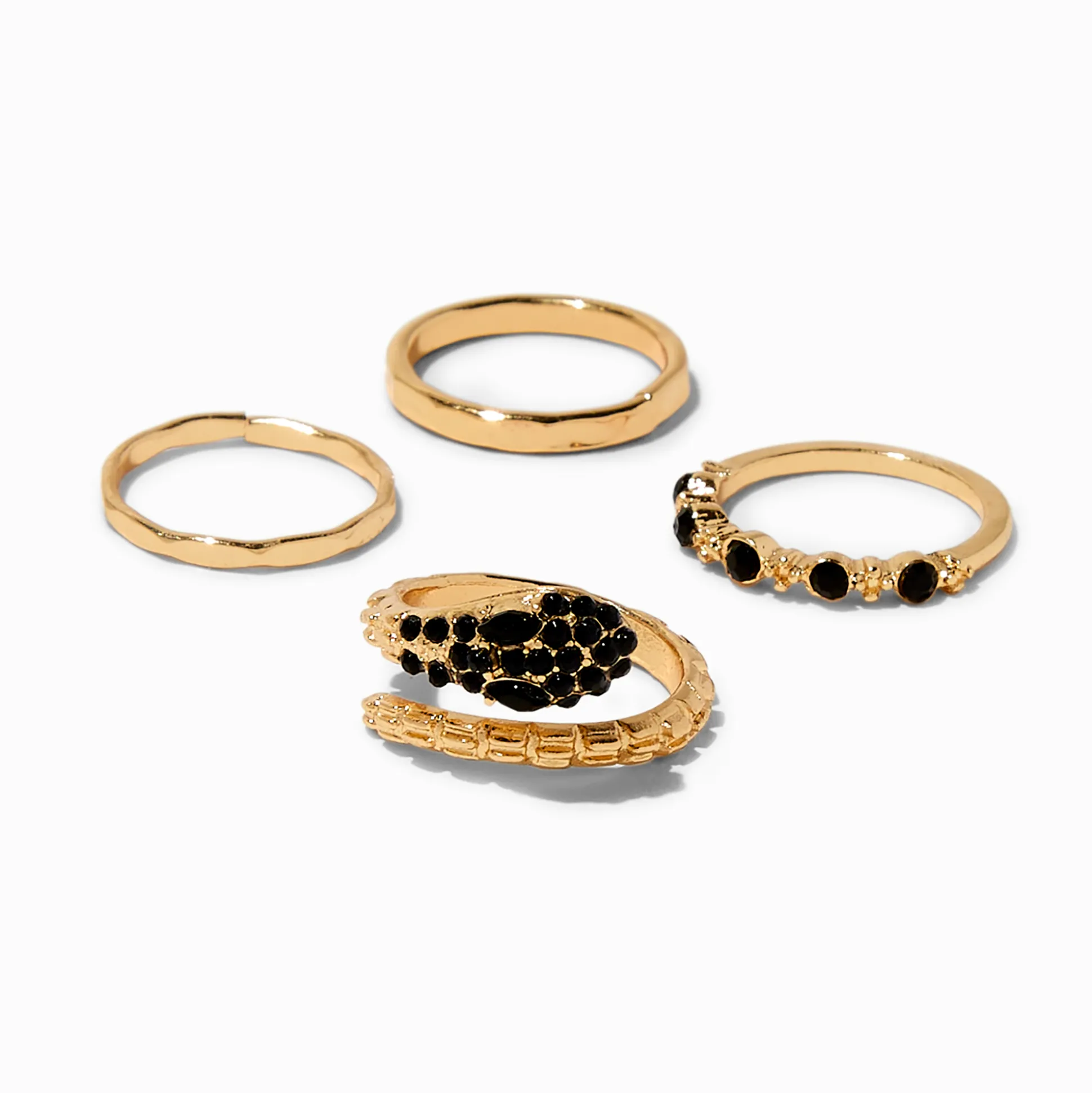 Get slithery style with this gold-tone ring set. The four pack includes one snake ring embellished with faux black crystals, a faux black crystal band, and two plain ones.