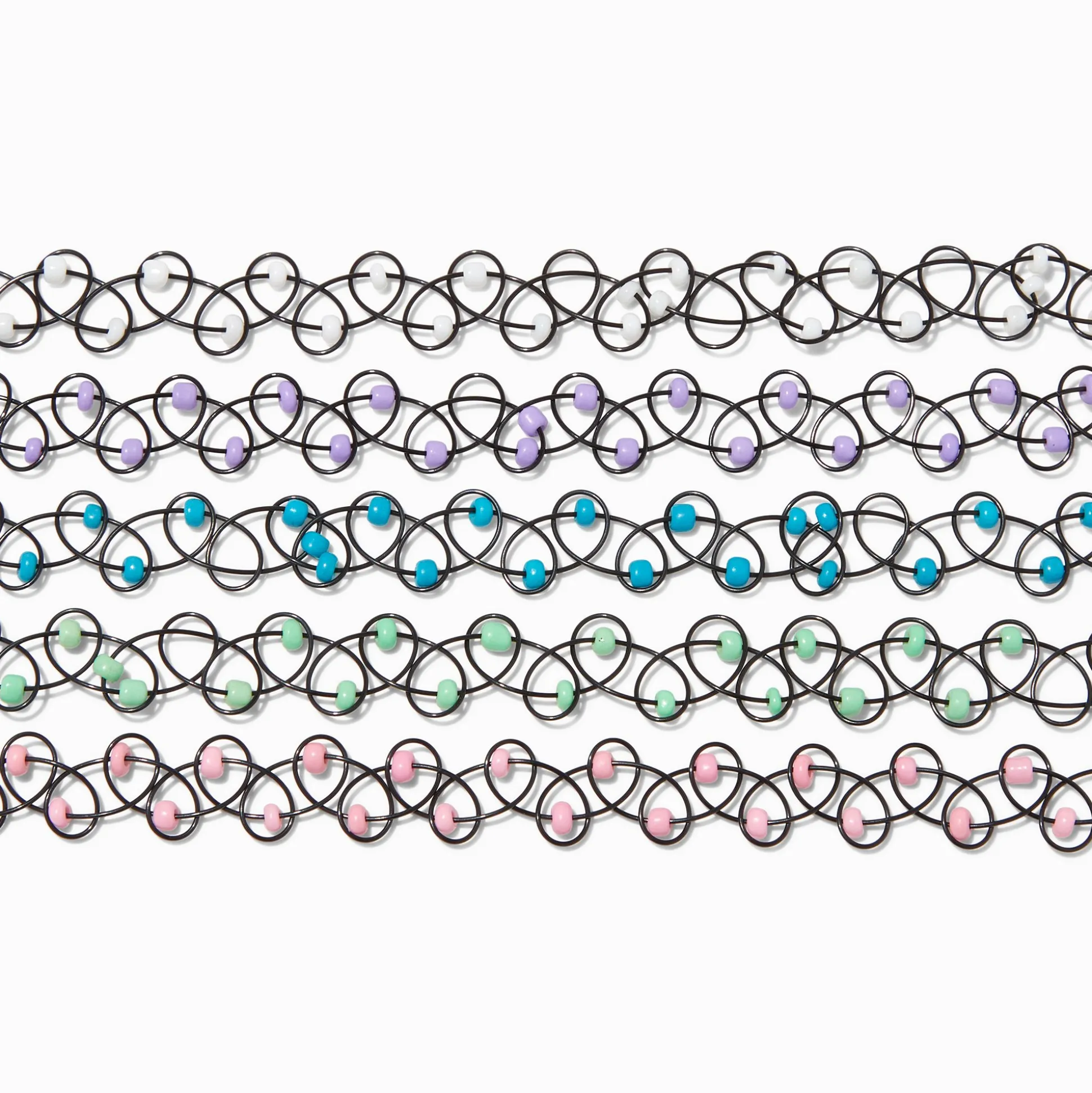 Always have the perfect choker to match your vibe with this five-pack set. The black tattoo chokers include white, purple, blue, green, and pink beaded options.