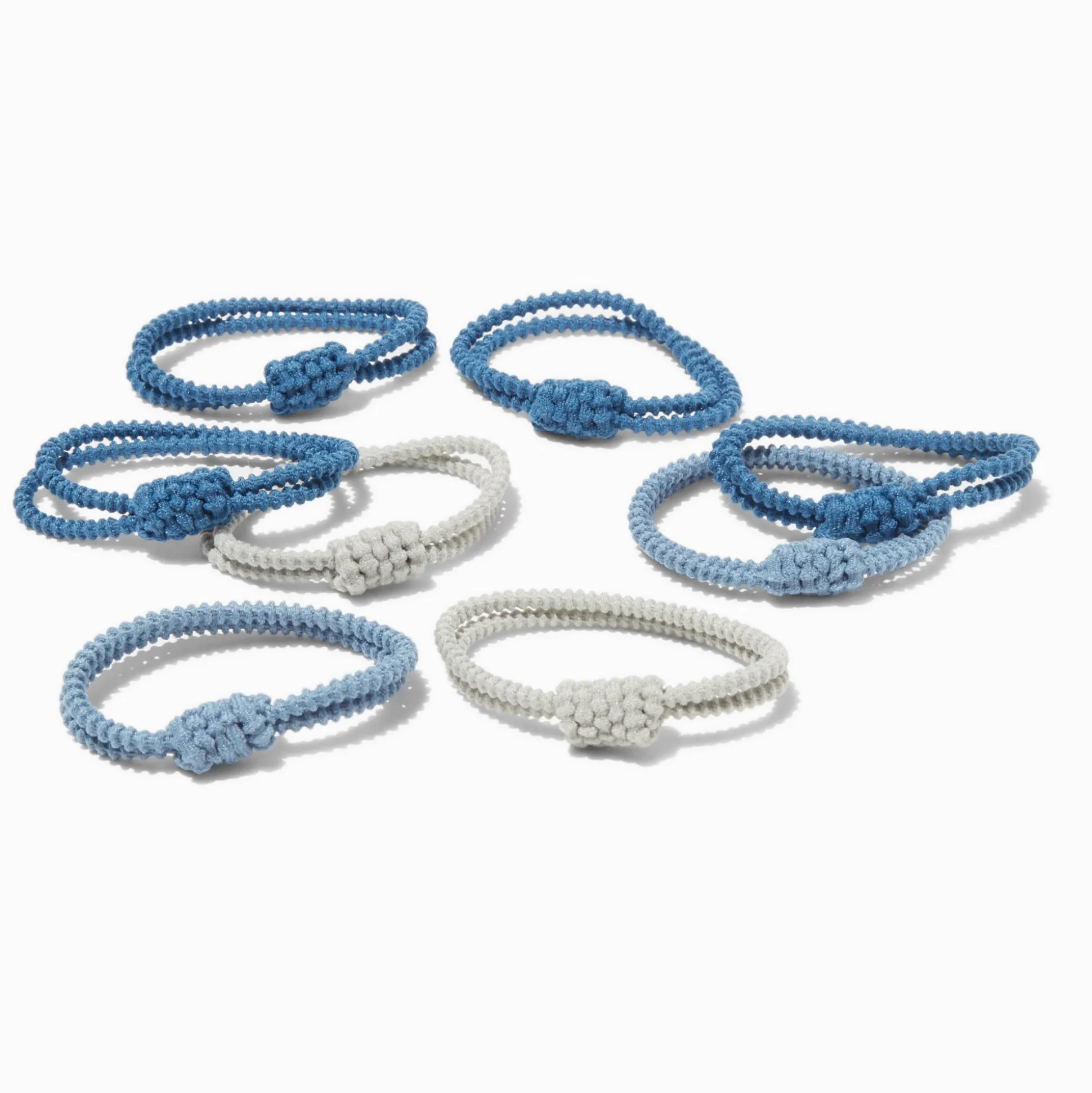 Keep your head in the game and your hair out of your face with these athletic knit hair ties. This 8-pack set has knit details in shades of blue and white.