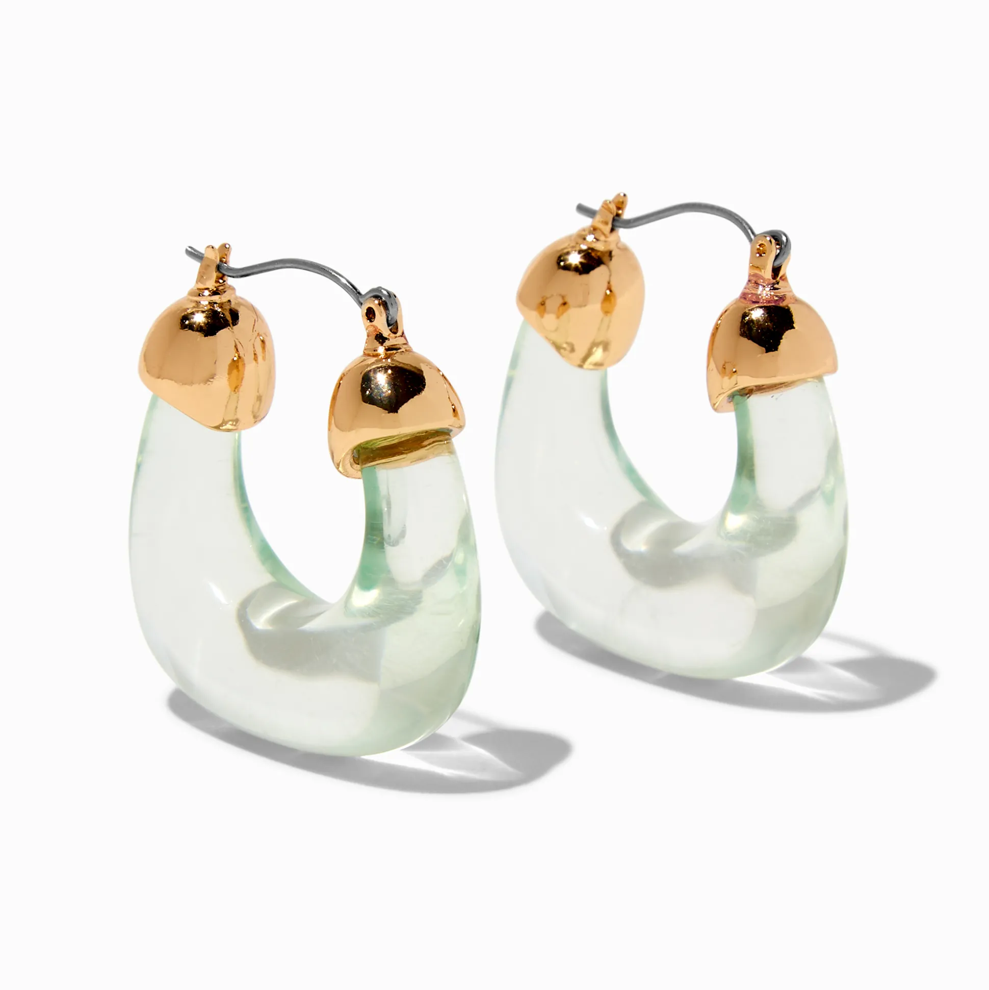 Go clear in these easy gold-tone hoop earrings. The oval shape is covered in blue-hued clear acrylic.