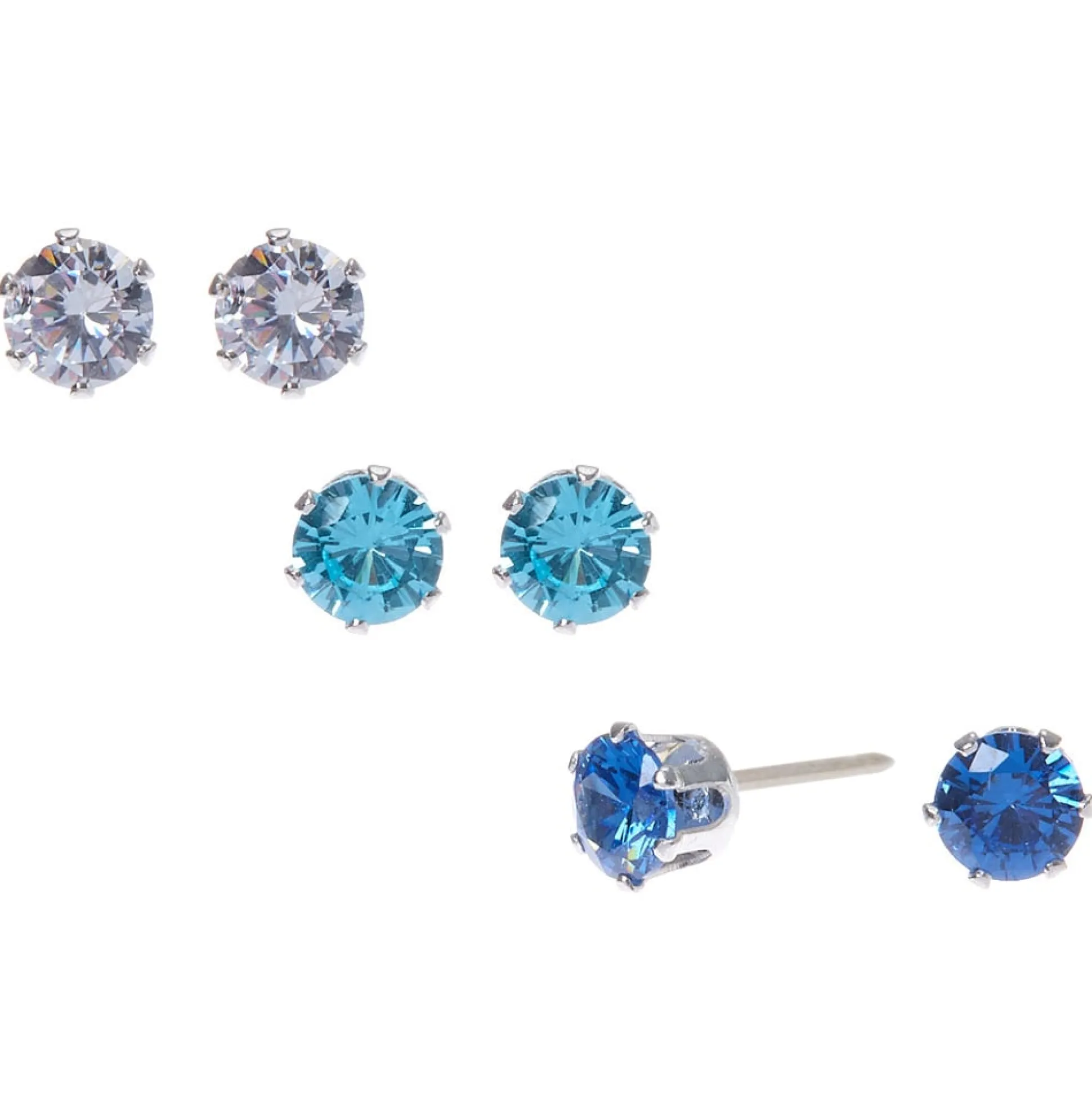 Feeling blue? These cubic zirconia stud earrings are perfect for you! This set comes with 3 pairs of earrings in clear, light blue, and blue.