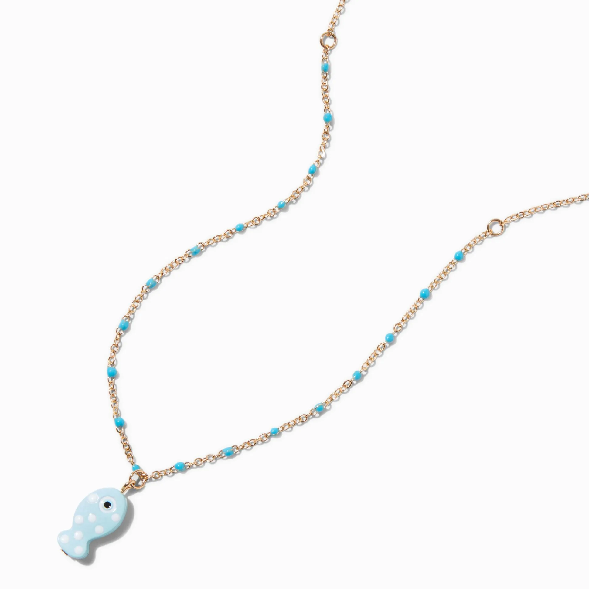 Go fish in this super cute pendant necklace. The gold-tone chain has equally spaced turquoise beads around it, and it’s finished with a delightful blue fish pendant.