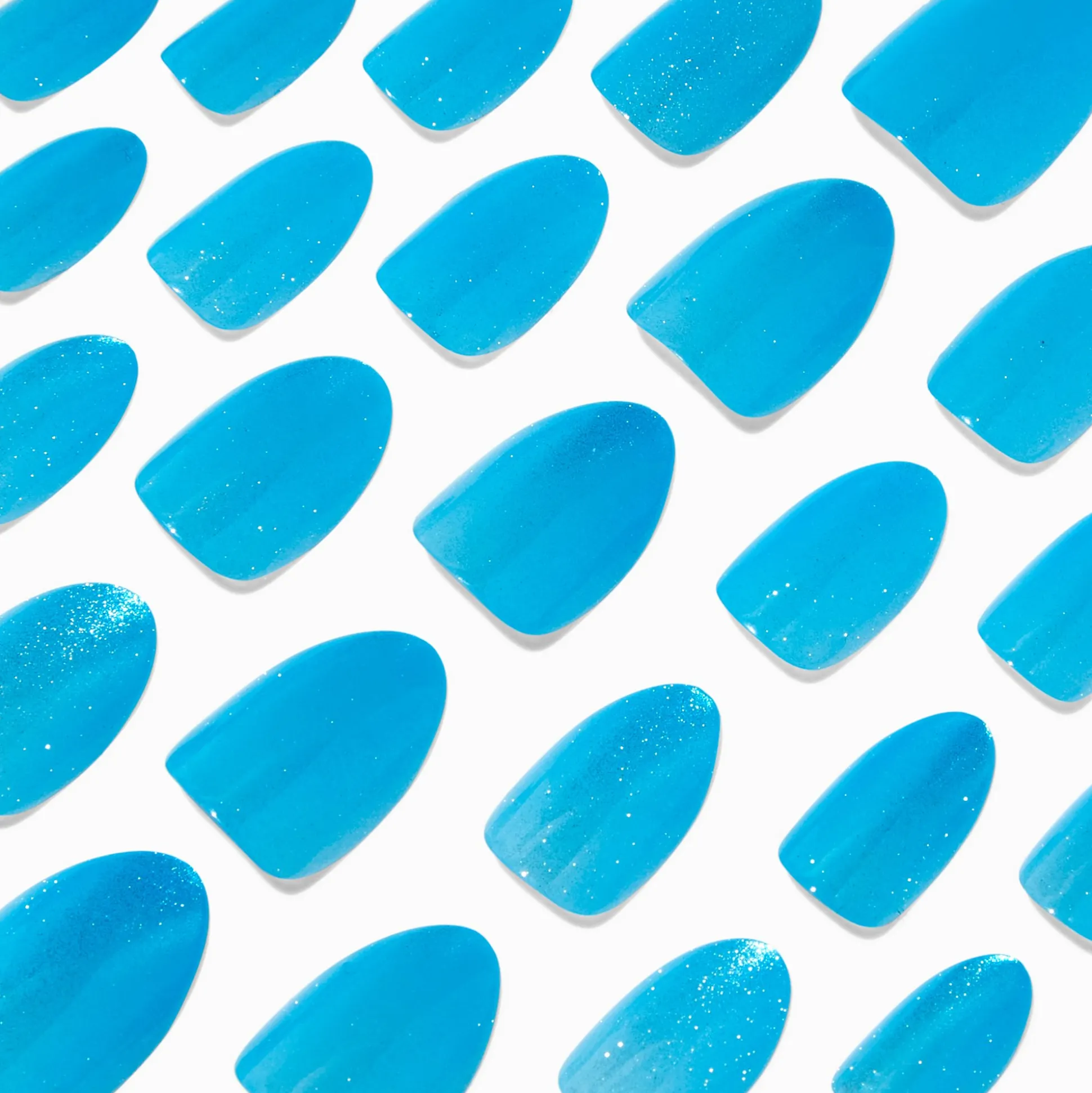 With an improved fit and up to a 7-day wear, these almond vegan faux nails are on-trend faves. They come in 12 different sizes, so finding the perfect shaped nail is a breeze. With an almond shape, these faux nails have a blue glitter gel finish.