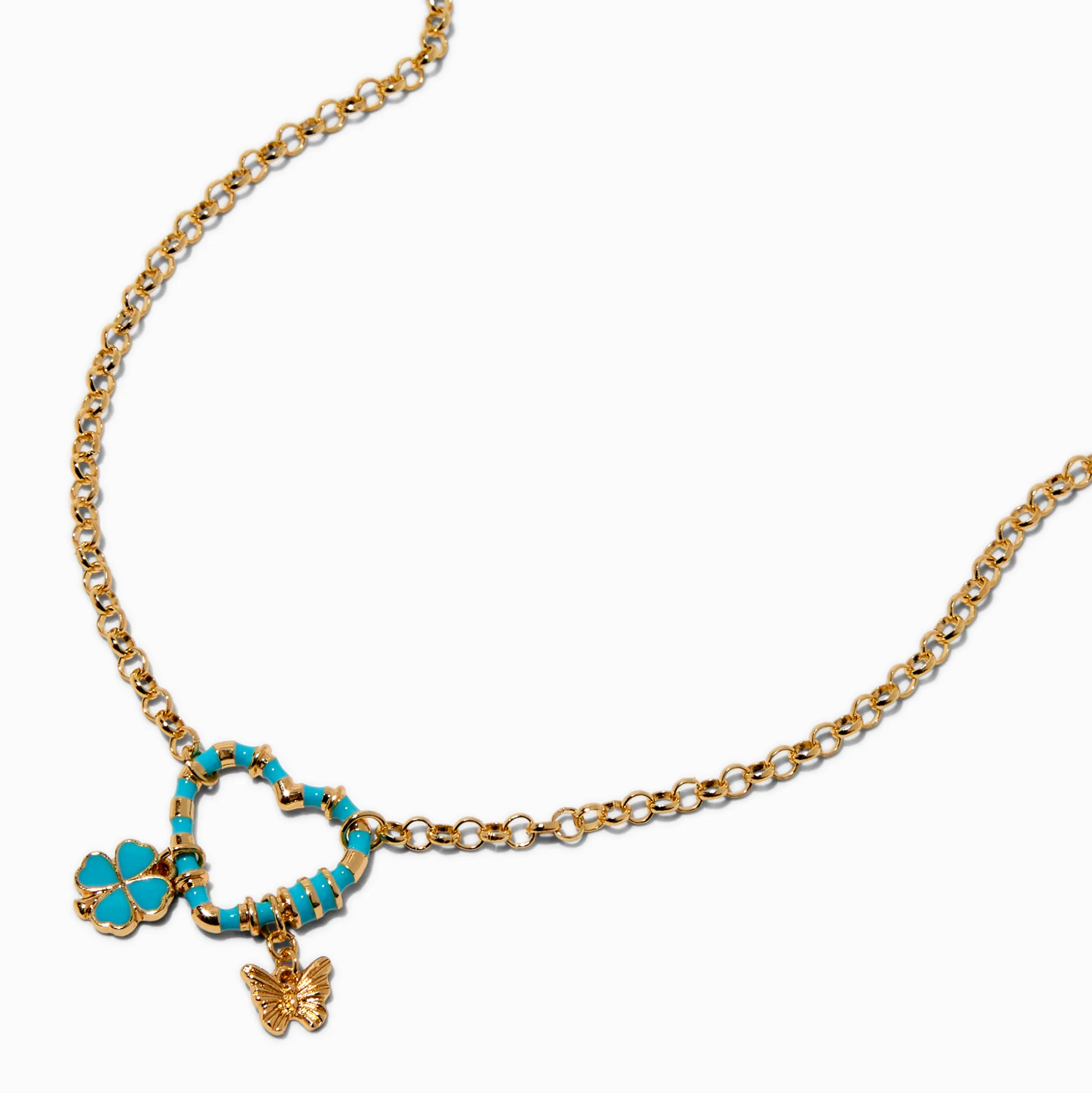 You’ll find this pendant necklace to be absolutely charming. The gold-tone chain has a heart-shaped carabiner-style pendant that has a clover leaf and a butterfly charm.