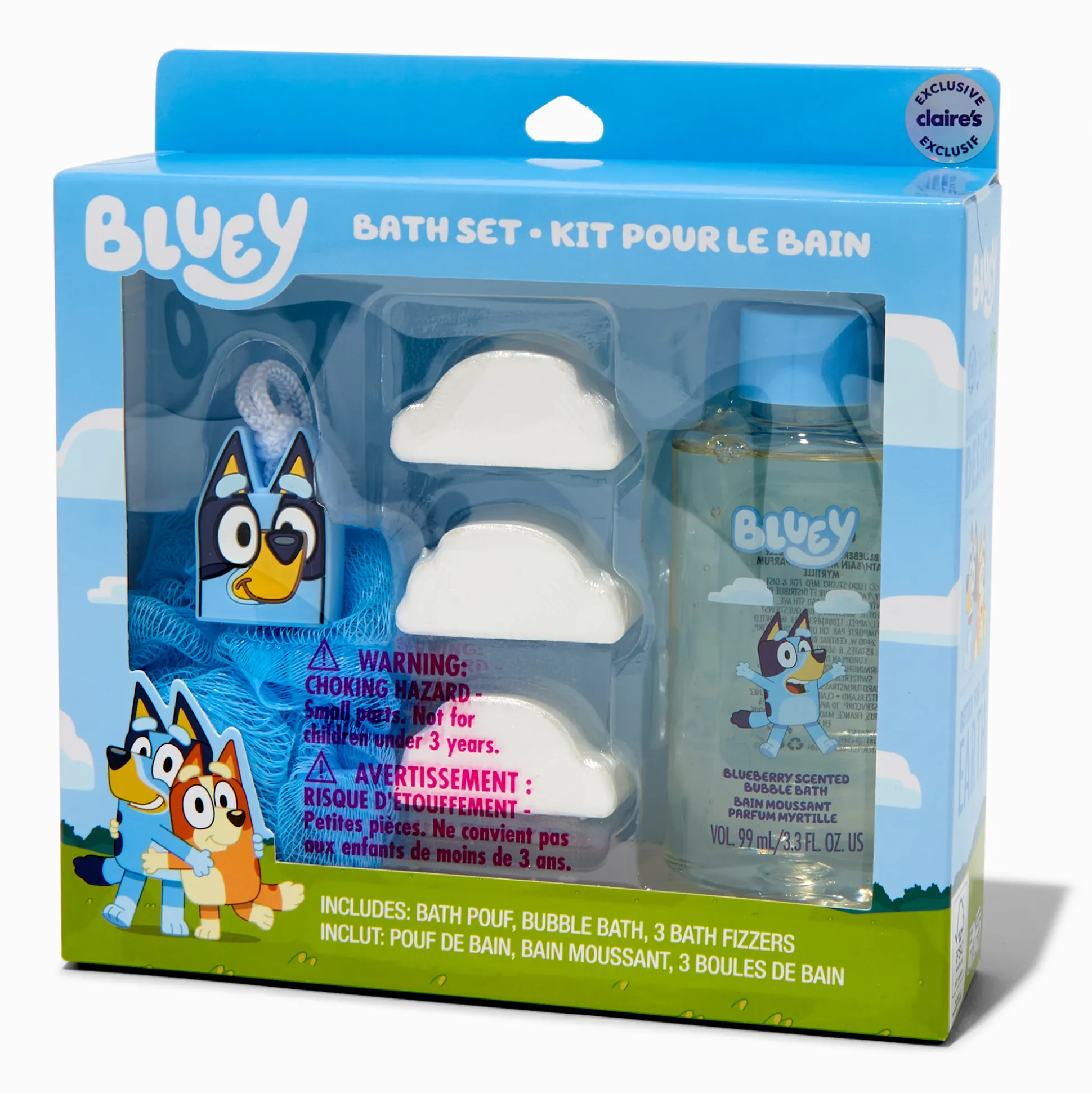 Bluey at bath time! What could be better? Exclusive to Claire’s, this set includes a Bluey bath pouf, bubble bath, and three cloud-shaped bath fizzers.