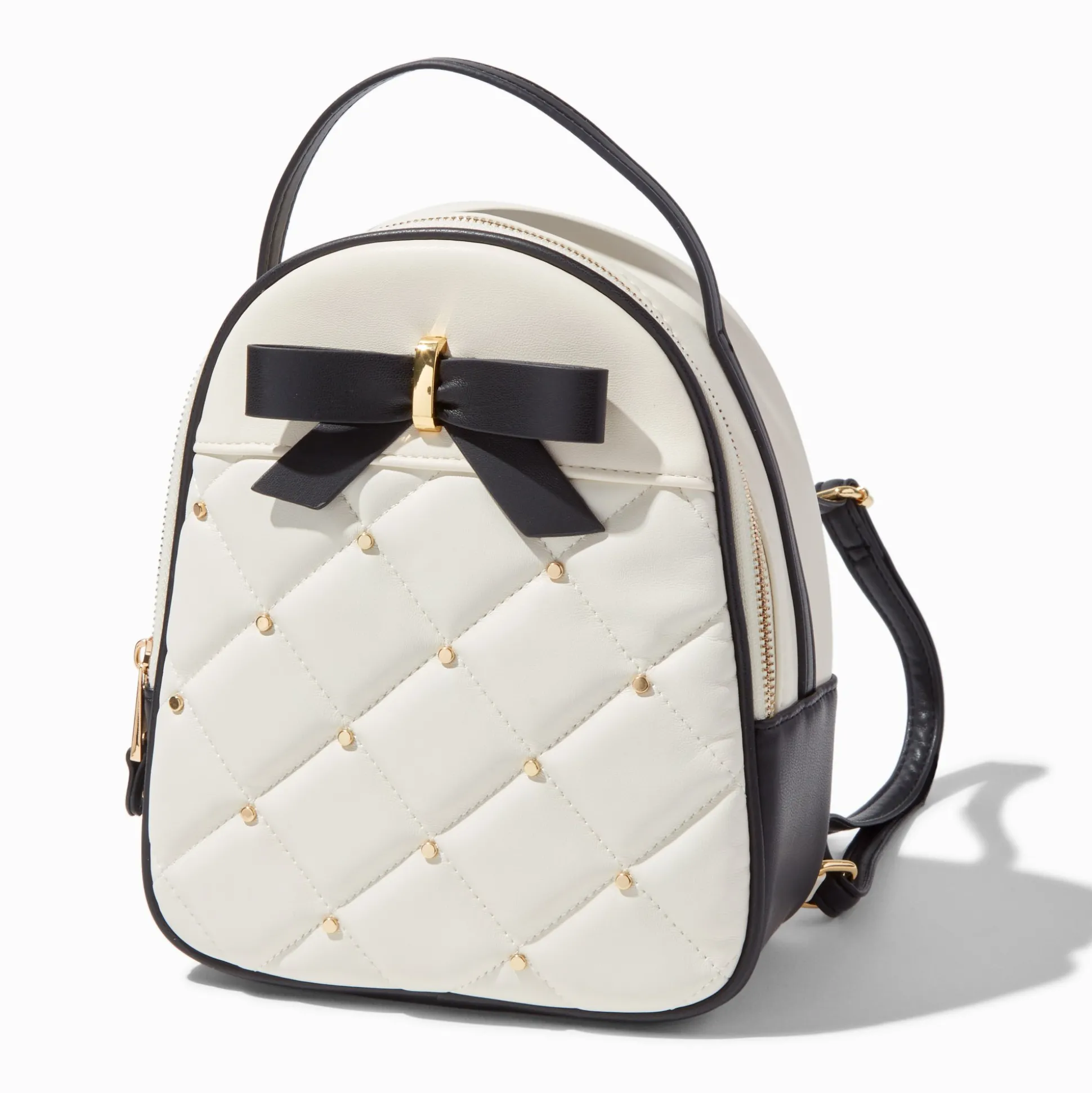 Small in size but big on style, this petite backpack is decorated all over with a quilted design and a dainty black bow! Inside the main compartment and the front pocket, there’s just enough room for a few essentials, like your phone, wallet, and keys.