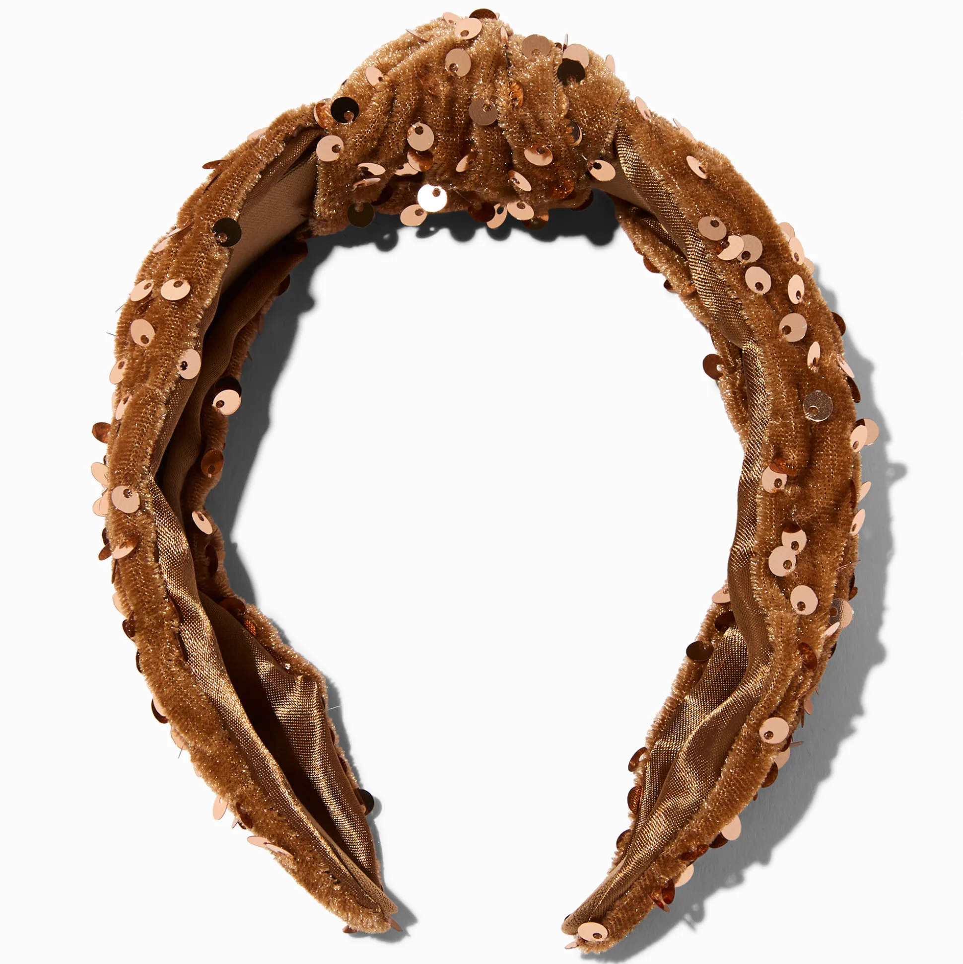 This party-ready headband will look great with all your special occasion looks. It features a wash of bronze sequins and a classic knot on top.
