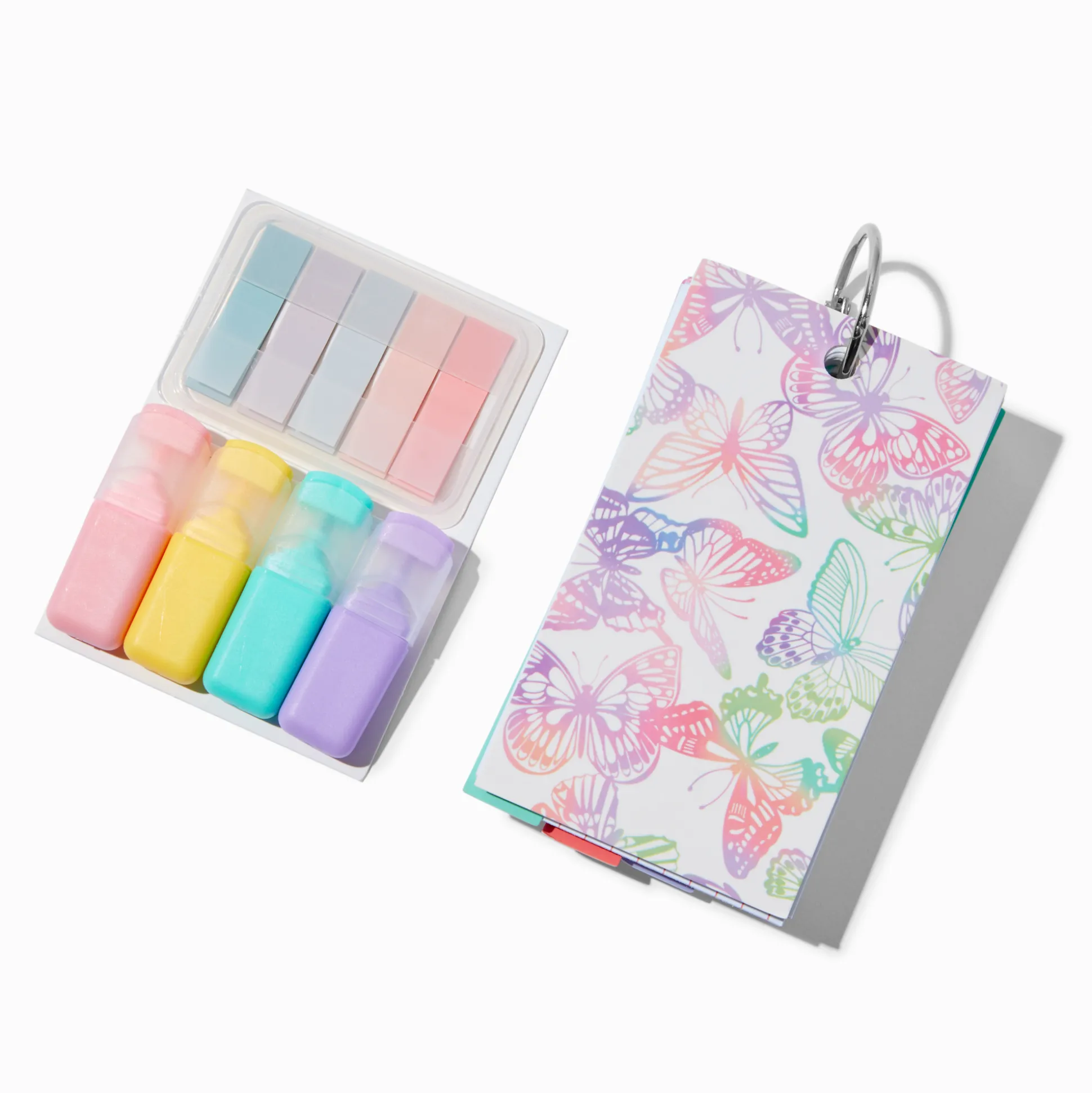 Annotate all your notes in pastel style with this must-have set! This set includes mini highlighters, sticky tabs, and a butterfly-adorned index card stack.