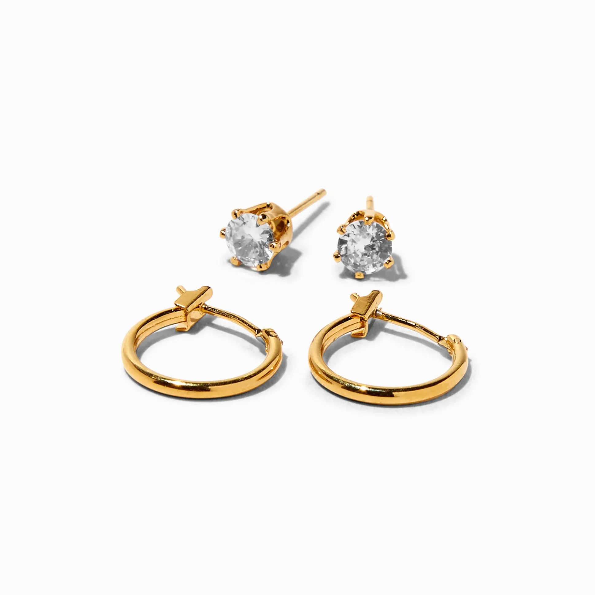 Change up your look with this set of earrings. The set includes a pair of round cubic zirconia studs and a pair of huggie hoop earrings each plated with 18k gold.
