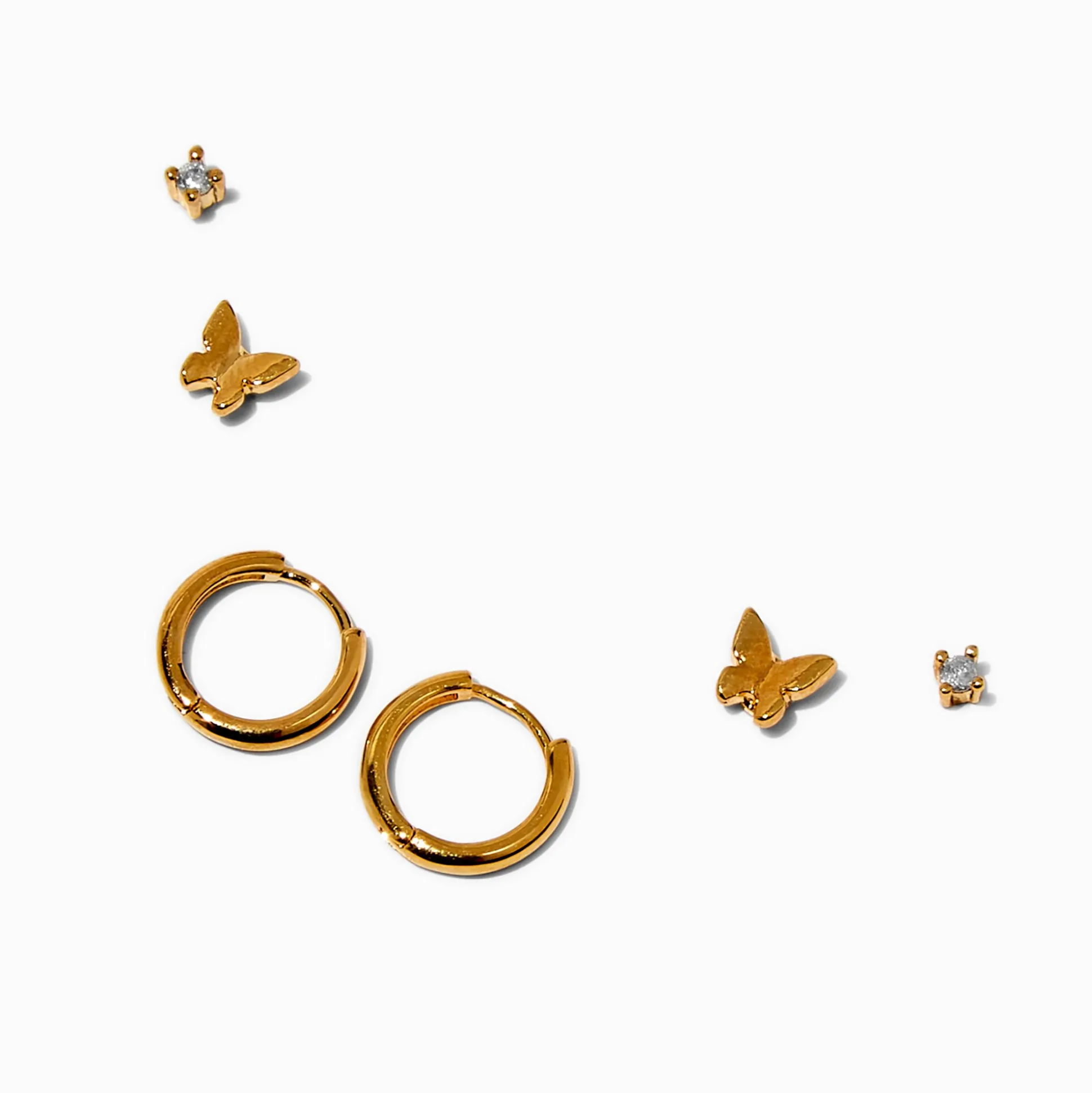 Change up your look with this set of earrings from our C LUXE by Claire’s jewelry collection. The set includes a a pair of butterfly-shaped stud earrings, a pair of round cubic zirconia studs, and a pair of huggie hoop earrings each plated with 18k gold.