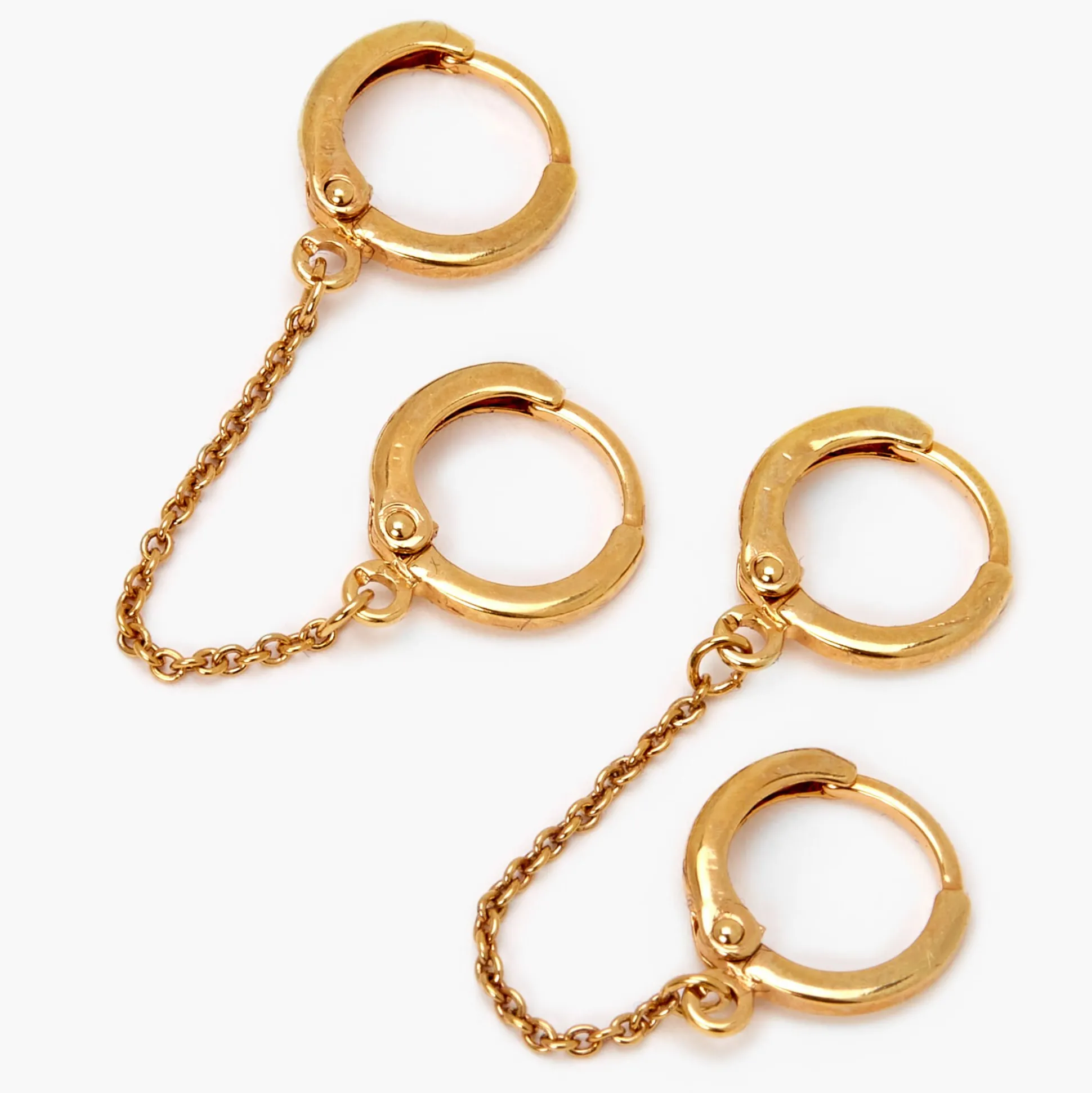 Accentuate your double piercing with these cool 18kt gold plated earrings. Two hoops are connected to each other by a delicate gold-tone chain for a look that’s as fun as it is fashionable.