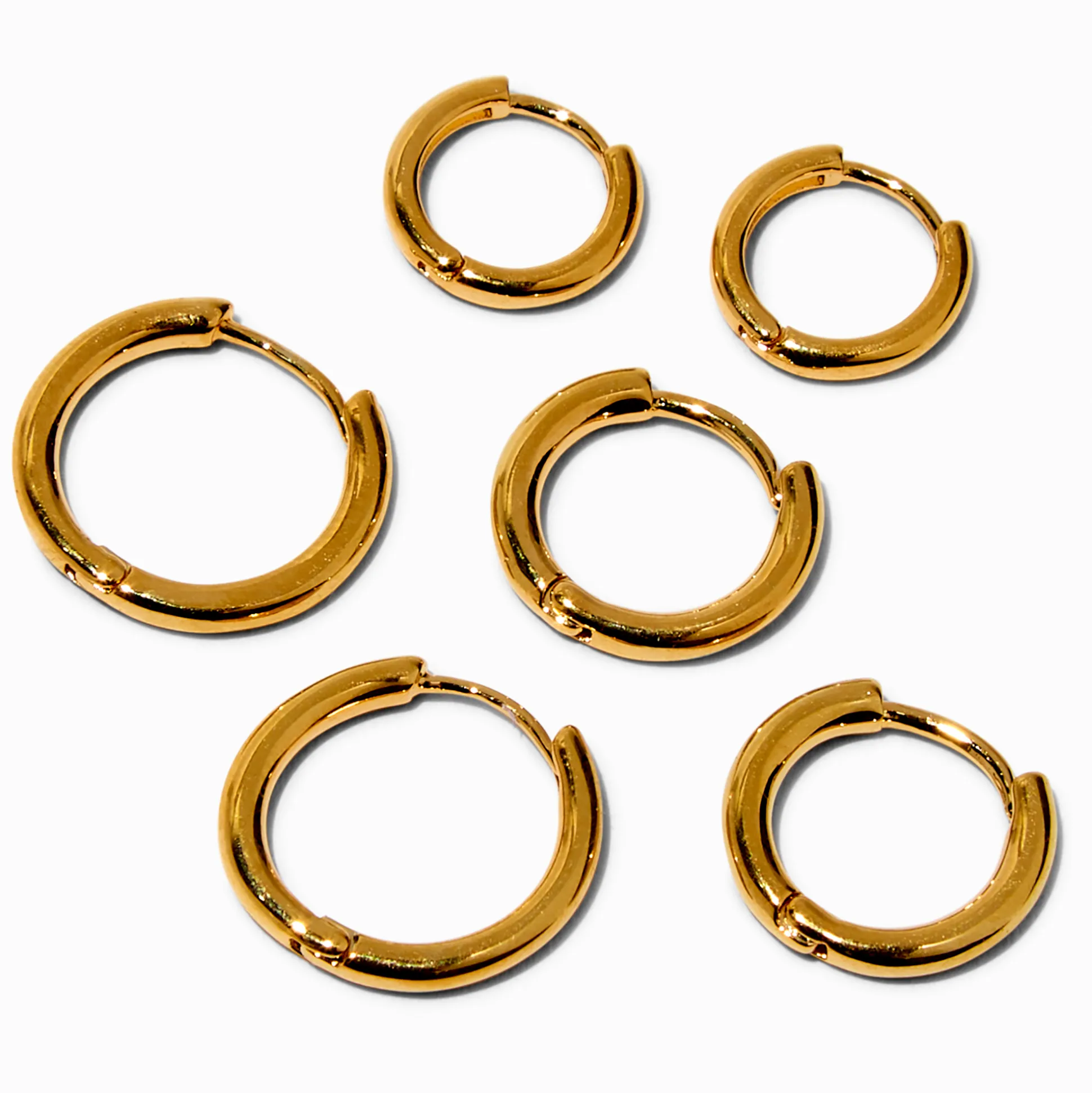 Get a classic look by wearing gold hoops. The set includes three pairs of 18kt gold plated earrings in different sizes.