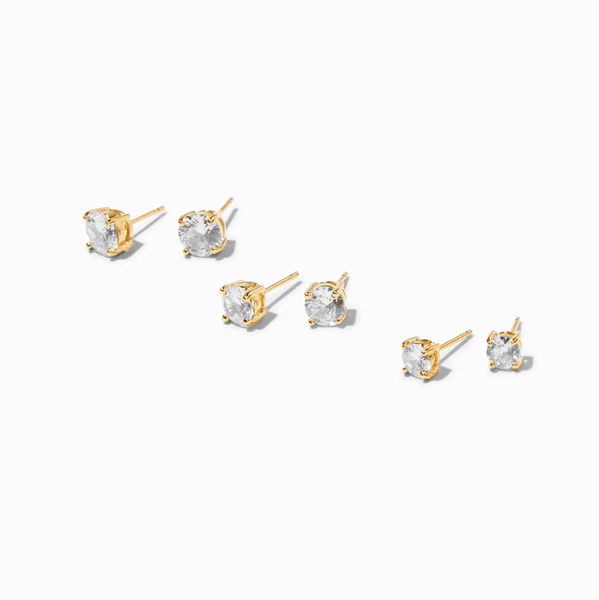 Keep it simple and beautiful with this pack of gold-plated stud earrings! The three pairs of studs include different sizes and are each complete with sparkly cubic zirconia stones.