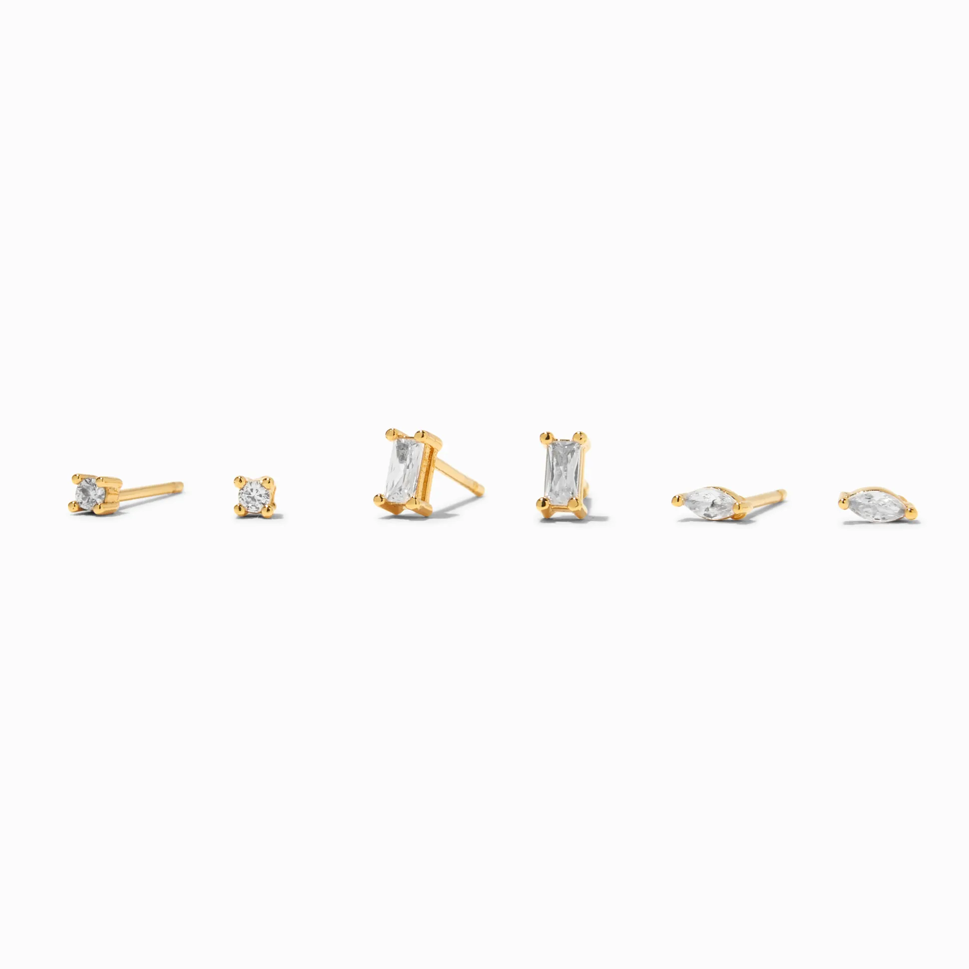 Keep it simple and classy with these beautiful studs from our C LUXE by Claire’s jewelry collection. The perfect set to complete any look, these three pairs of sparkly earrings feature round, marquise, and baguette-shaped cubic zirconia stones in a classic 18kt gold plated setting.