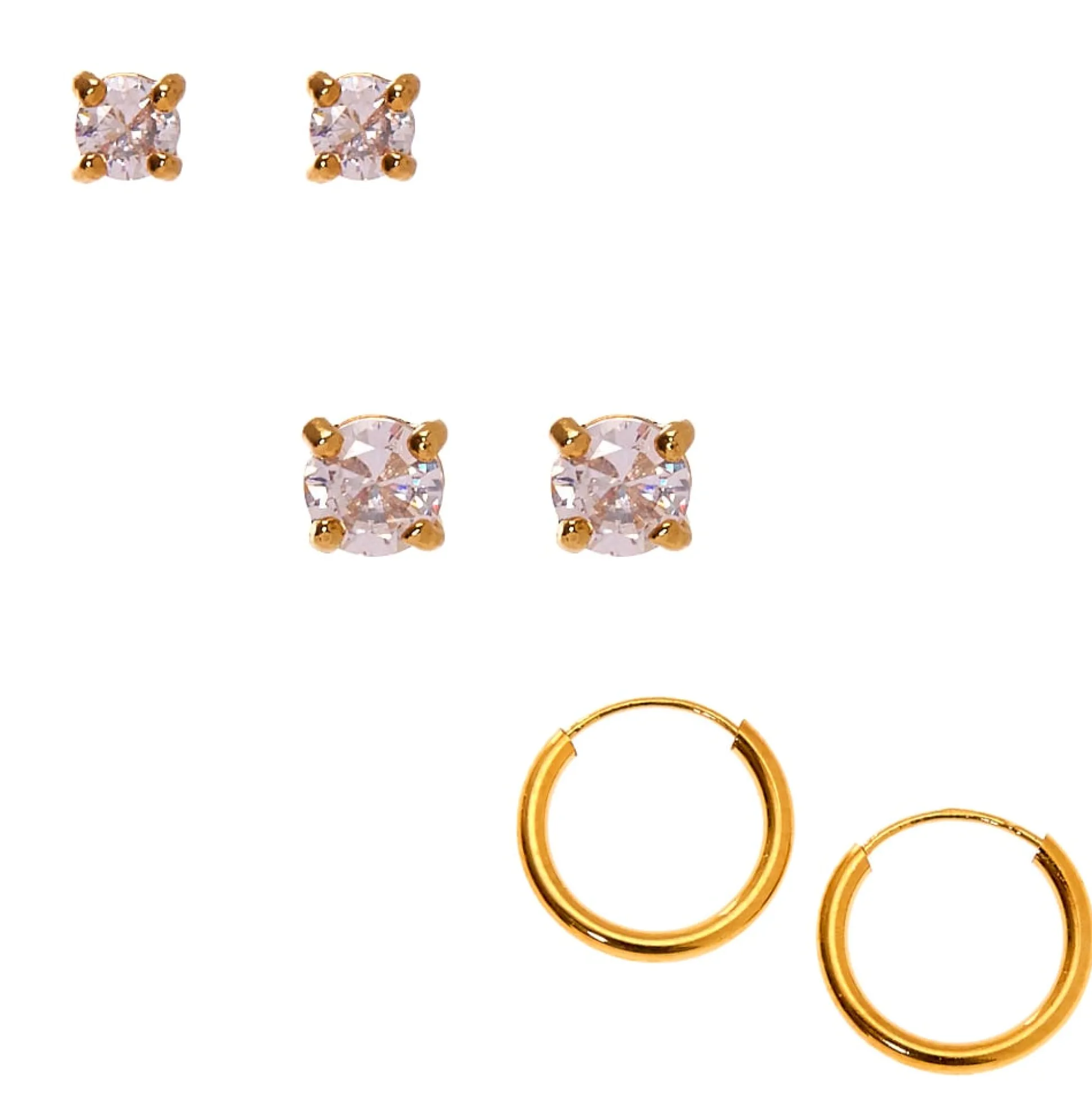 Get the best of both worlds with these mixed earrings! This 18kt gold plated pack features two pairs of stud earrings with sparkly cubic zirconia stones and a pair of small hoop earrings.