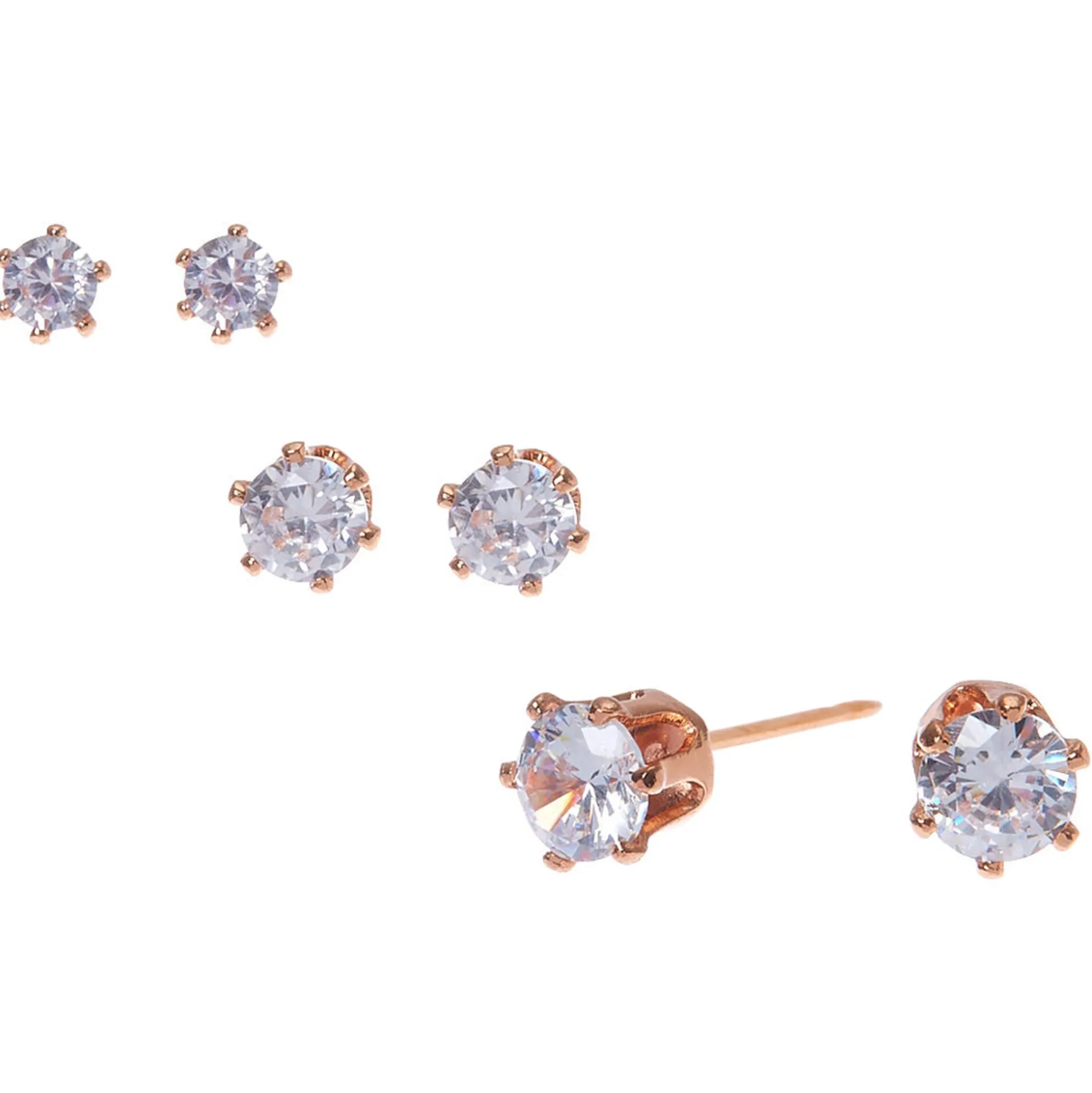 Three different sizes of sparkling studs offer multiple styling options! Wear one pair at a time, or if you have multiple piercings, stack them. The set includes all three pairs of gold plated studs shown, with a shiny rose gold finish and cubic zirconia stones that catch the light beautifully.