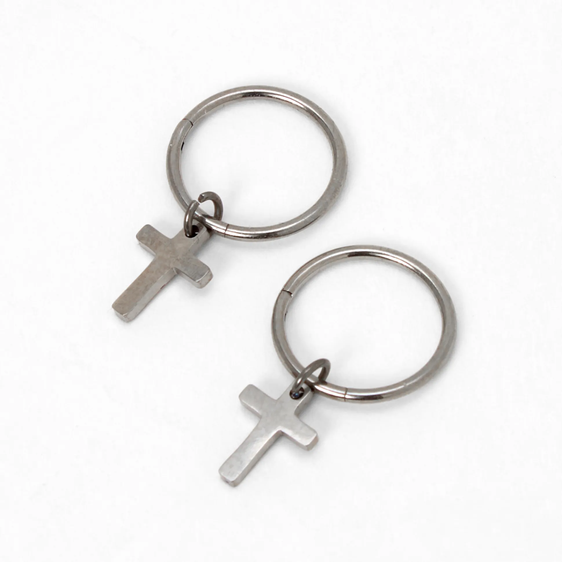 Show off your faith in style with a sleek pair of hoop earrings! These silver-tone titanium hoops feature an easy clicker hinge closure with a dangly cross hanging from the hoop and are part of our C LUXE by Claire’s jewelry collection.