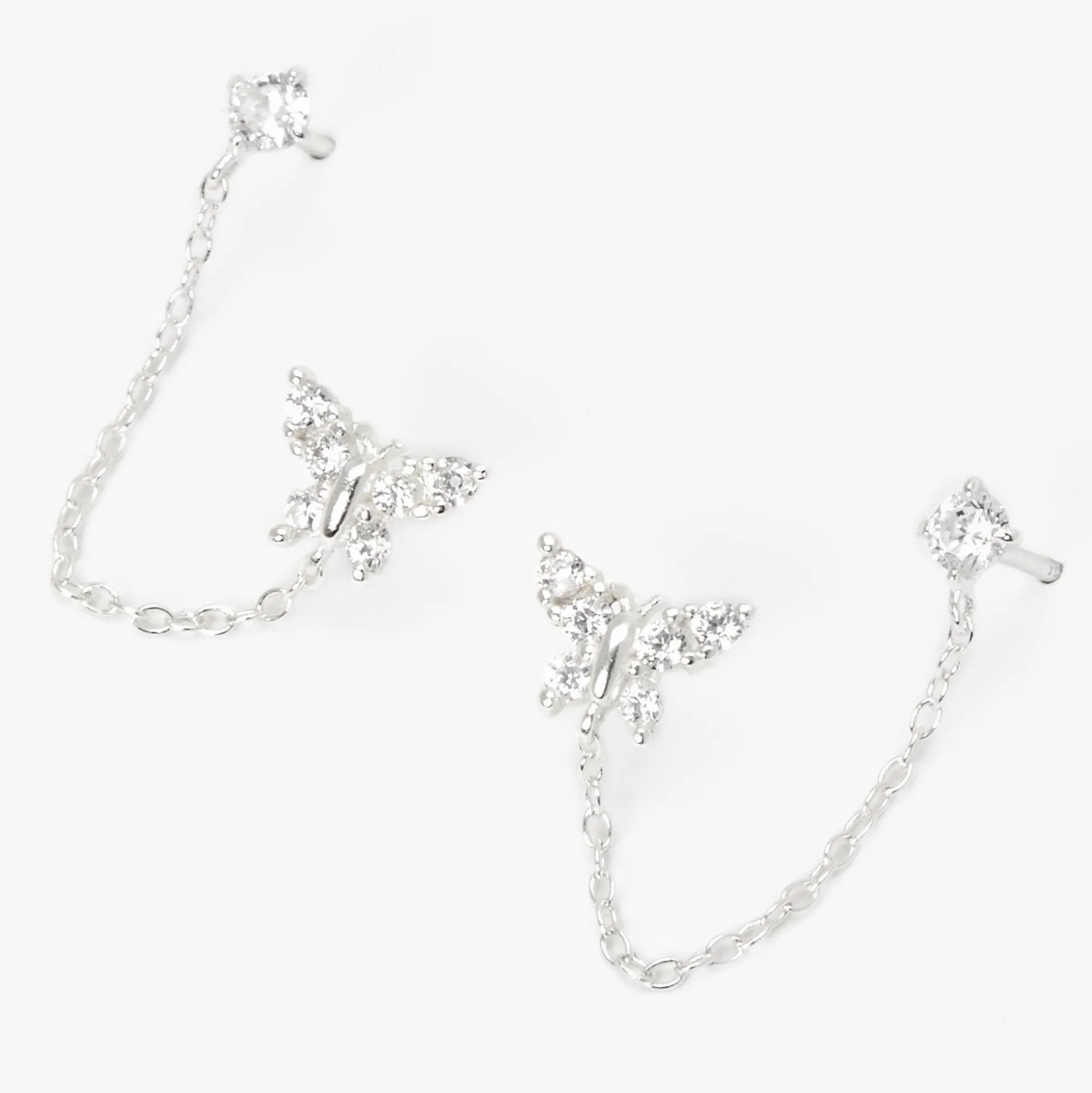 Make a springtime connection with these cool silver-tone earrings that earn added points for style. Two butterfly studs; one stud is linked by a delicate chain to a shiny three-row cuff that clips easily onto your ear cartilage with no additional piercing required.