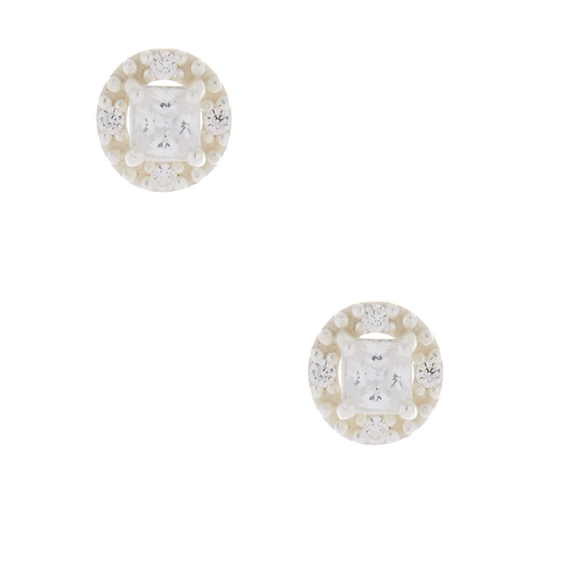 Switch up your earring look with this unique halo style pair! Perfect for a pop of sparkle, square cut cubic zirconia stones are layered over a circle stud.