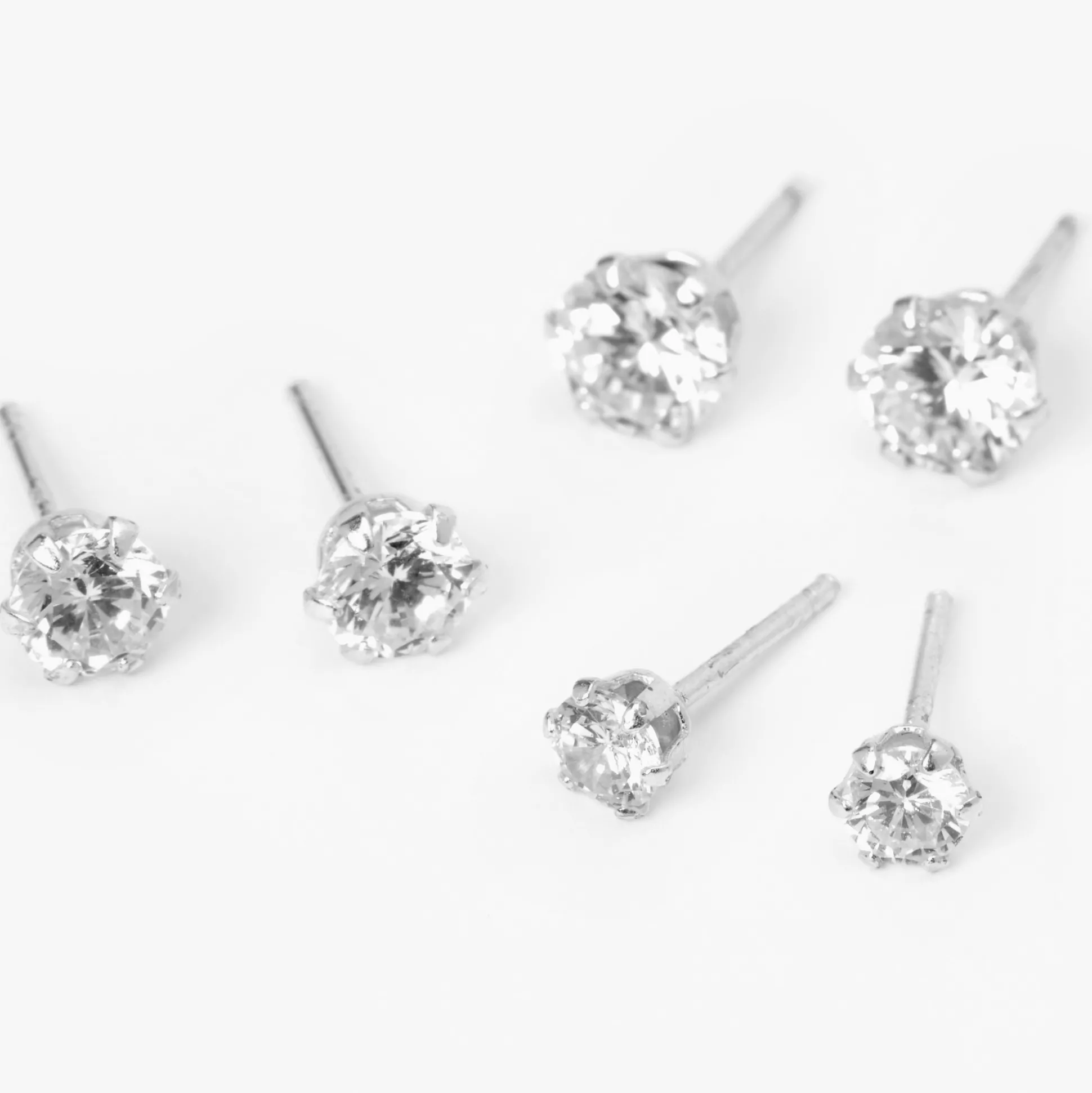 Add a pop of sparkle to your earring look with this stylish sterling silver set. This set of round cut cubic zirconia studs includes 3 pairs in 3 different sizes.