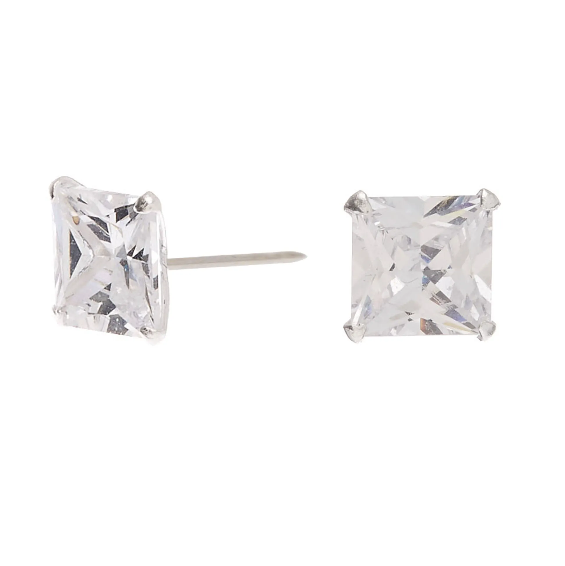 Add a shiny pop of sparkle to your ears with these sterling silver studs! This pair of earrings are a stunning square shape with cubic zirconia stones in a martini style setting.