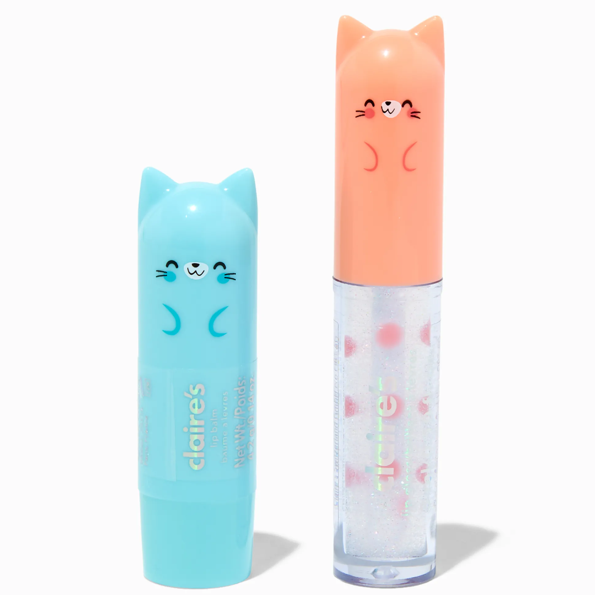 Have fun putting on your lip balm and lip gloss with this cute set! The set includes 2 yummy flavors of lip balm and gloss in kitty-shaped packaging.