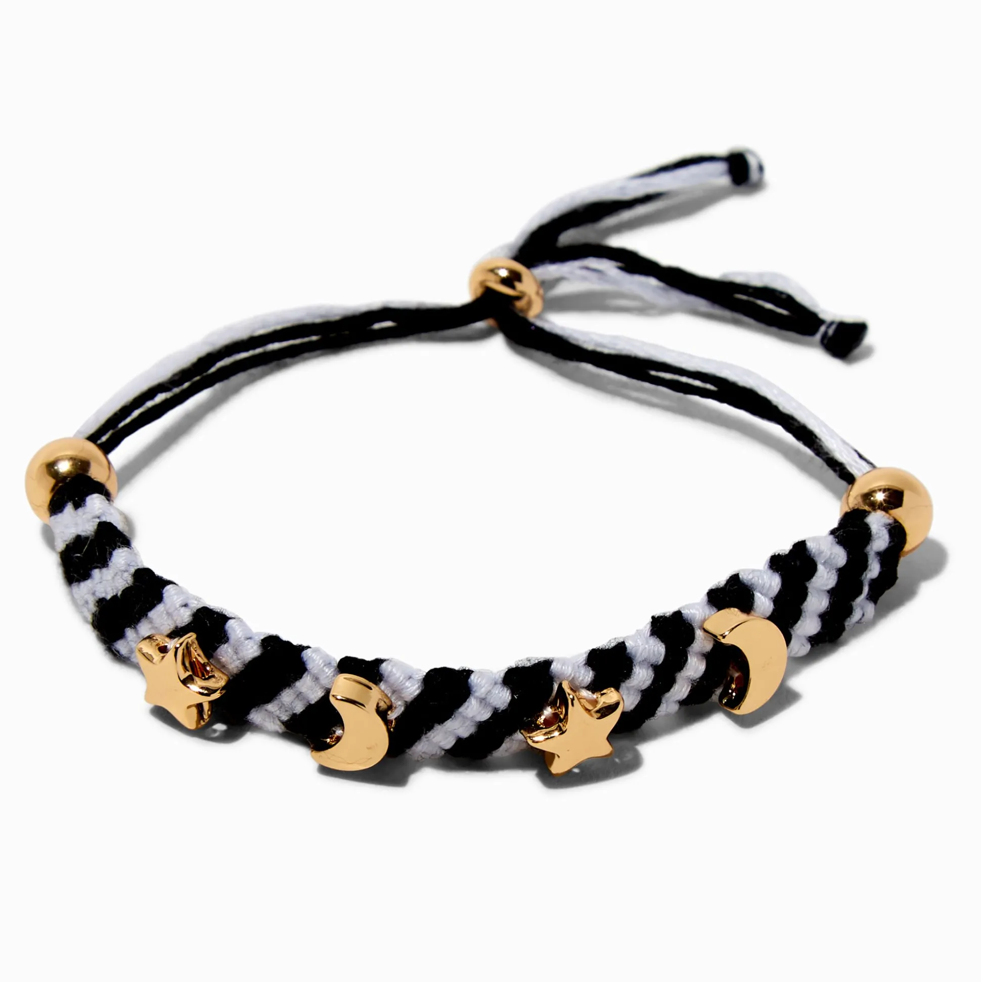 Slap celestial style to your wrist with this gold-tone beauty. The black and white woven bracelet is dotted with gold-tone stars and moons.