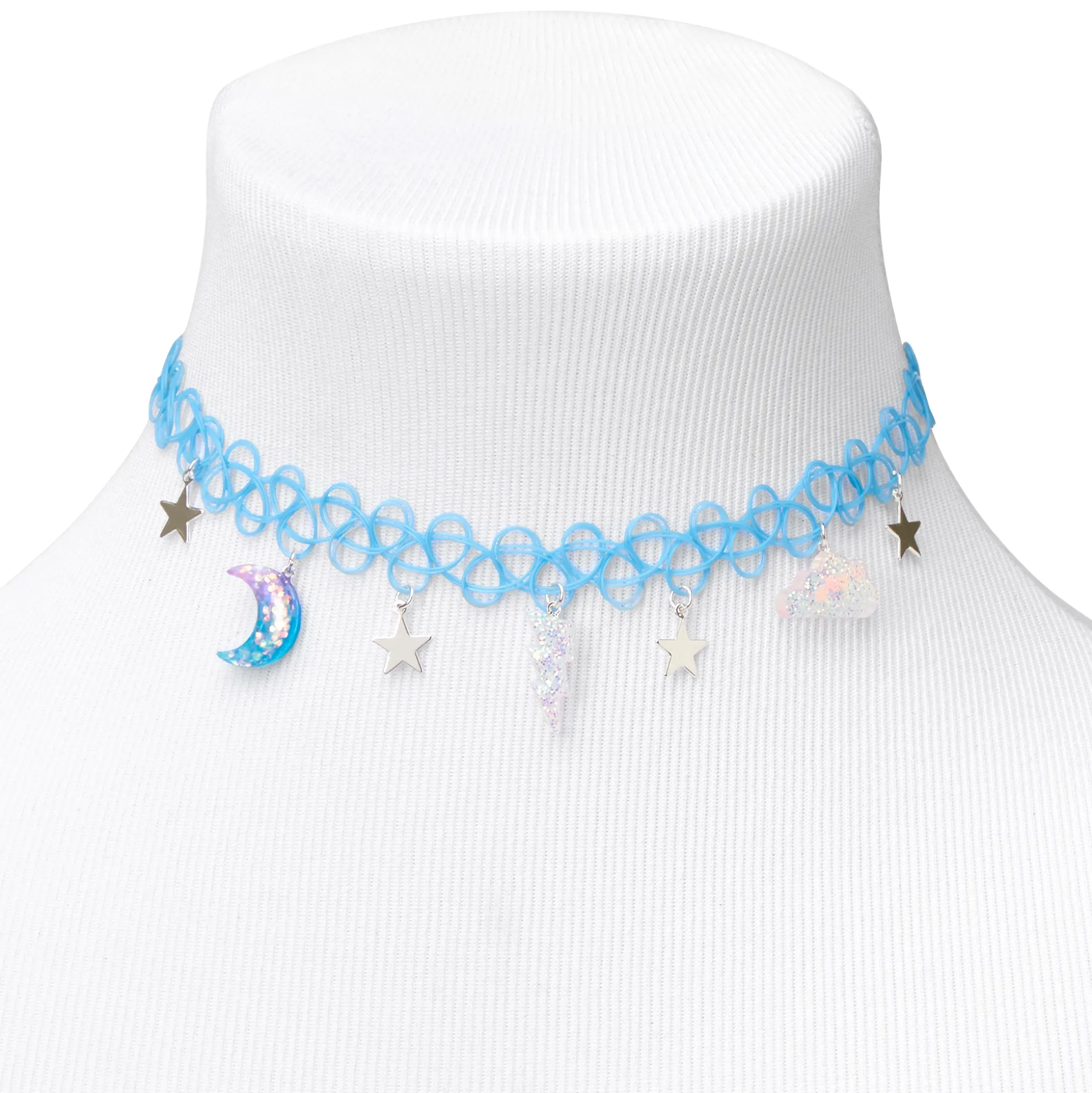 Moons, stars, clouds, lightning. This tattoo-style choker has all the icons in the sky! It stretches to fit.