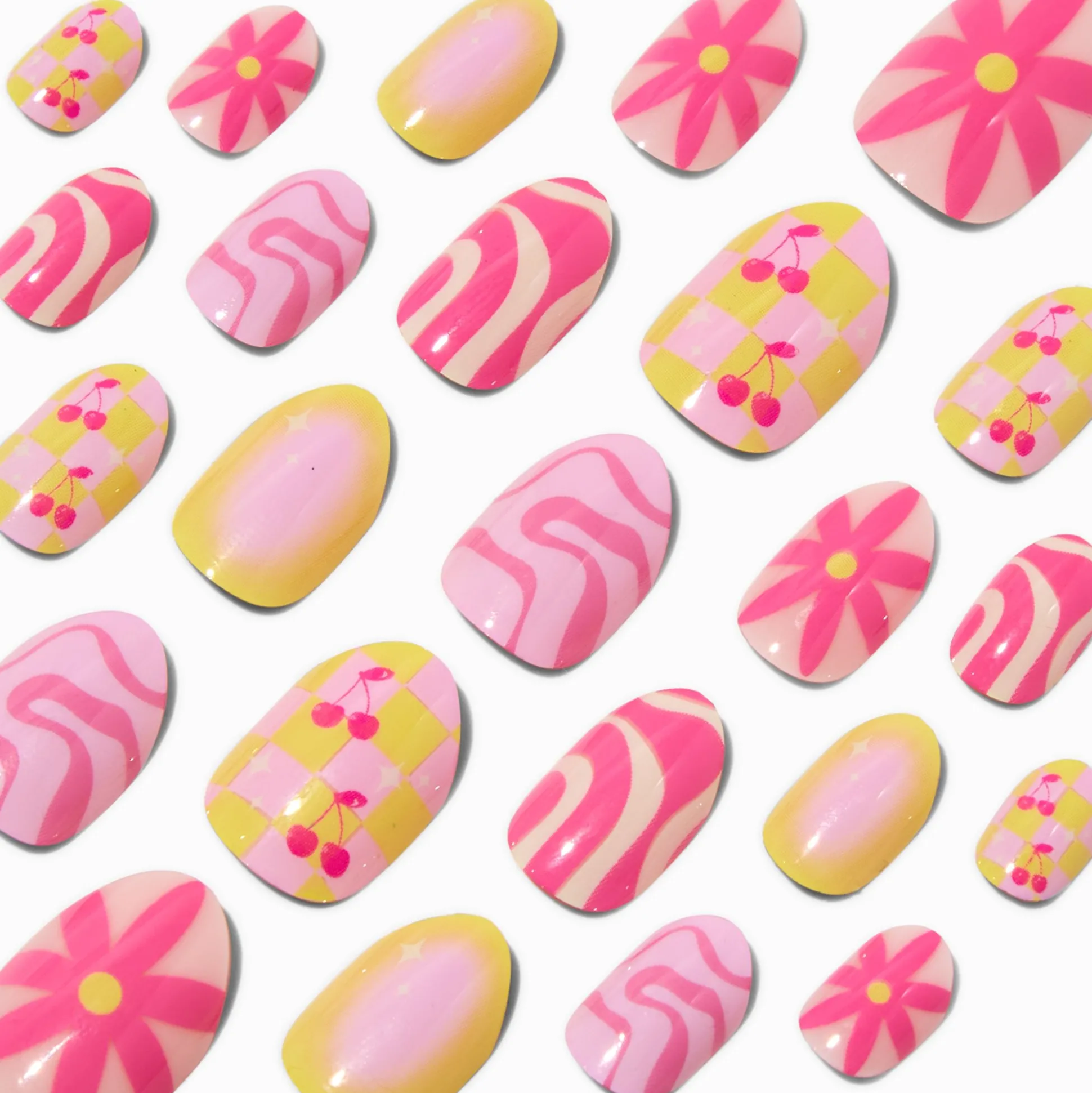 Serious vibes will be right at your fingertips with this on-trend set of faux nails. Stiletto-shaped nail set features a retro design. Vegan nails are easy to apply, just press on and go!