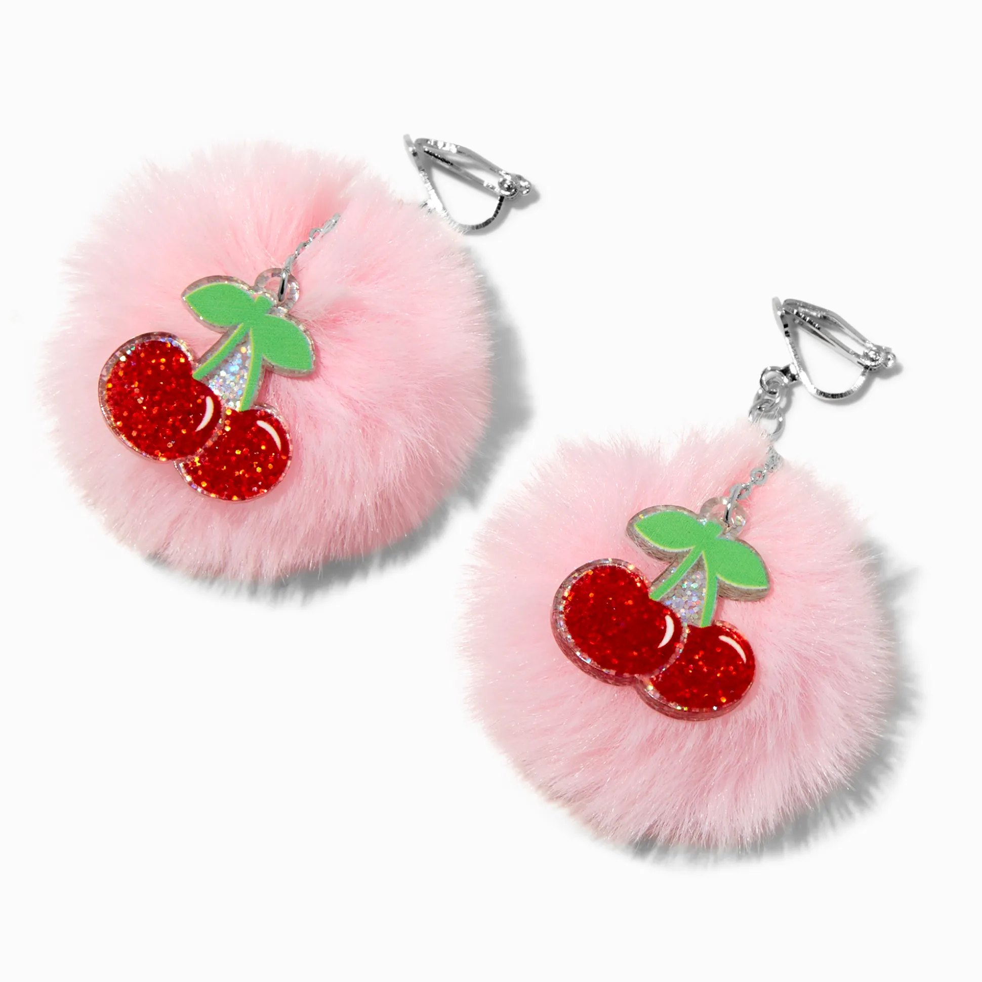 Add a fuzzy touch to your look! These super cute clip-on drop earrings feature a pom pom detail and an acrylic cherry design.