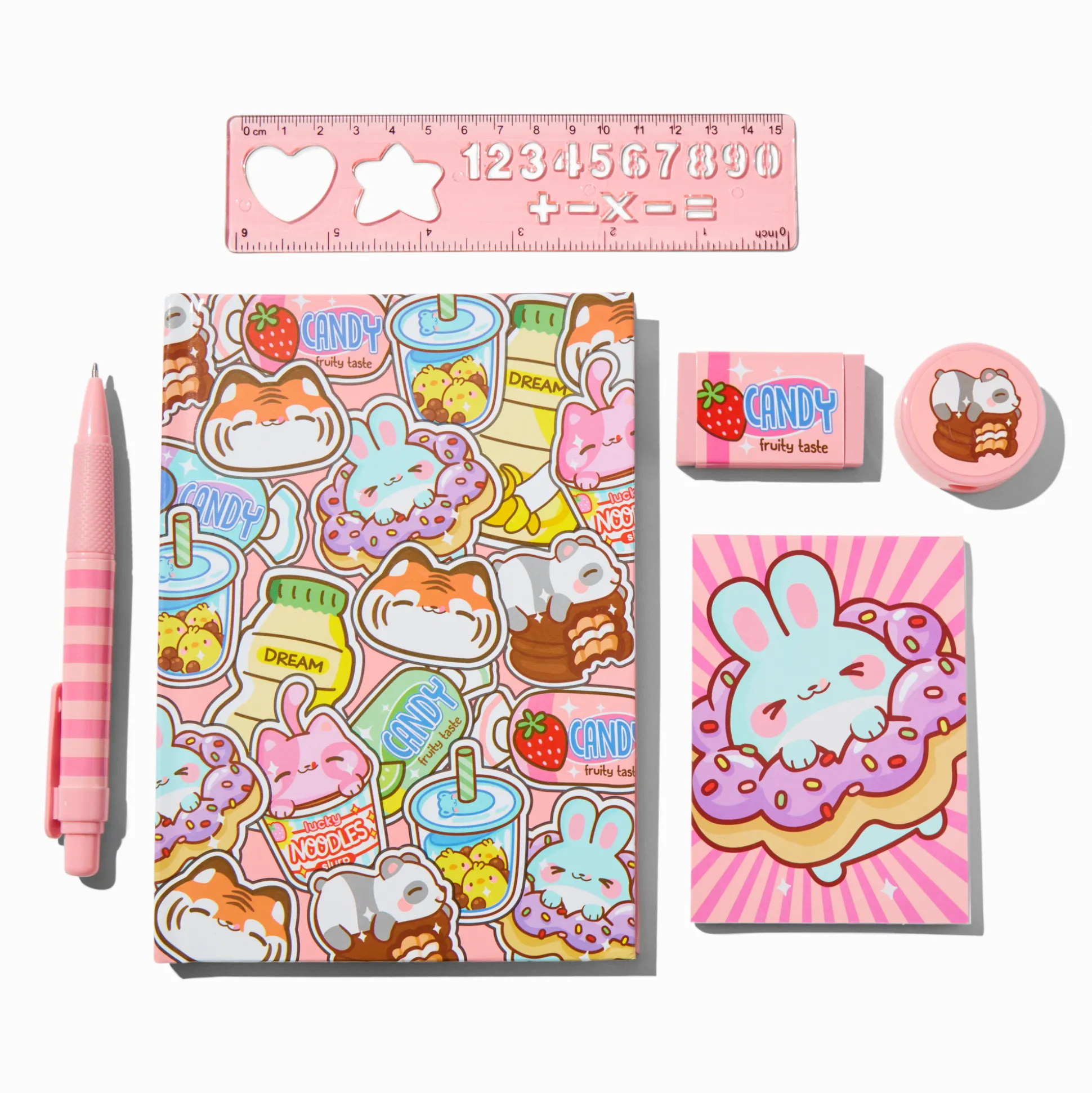 Decorated all over with an adorable design, this stationery set has everything you need for school and home! You get a pen, eraser, ruler, pencil sharpener, notebook, and mini notepad for doing homework, making lists, drawing pictures, and recording all your thoughts.