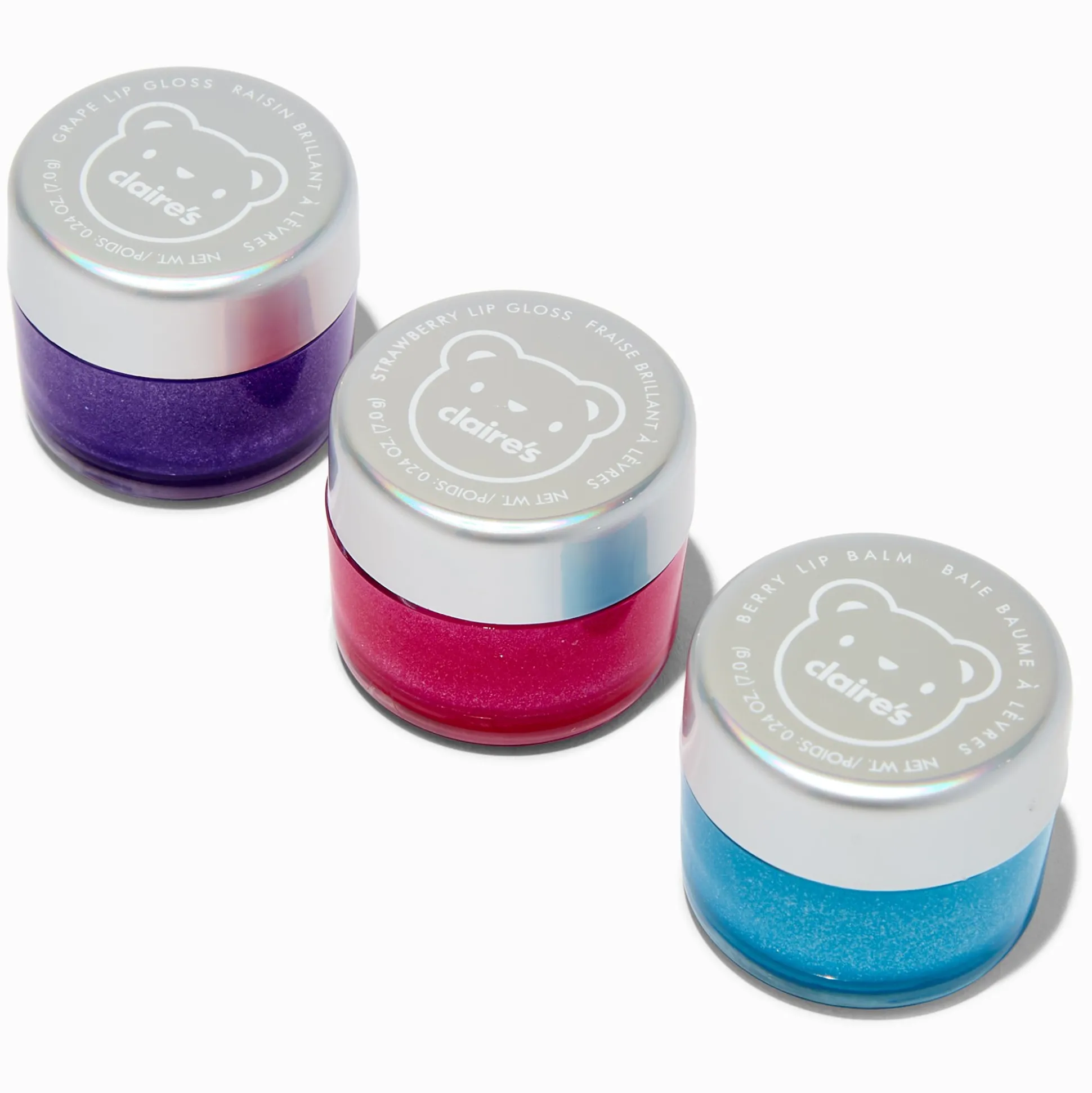 Have fun putting on your lip balm with this cute set! The set includes 3 different flavors of lip balm in chrome bear packaging.