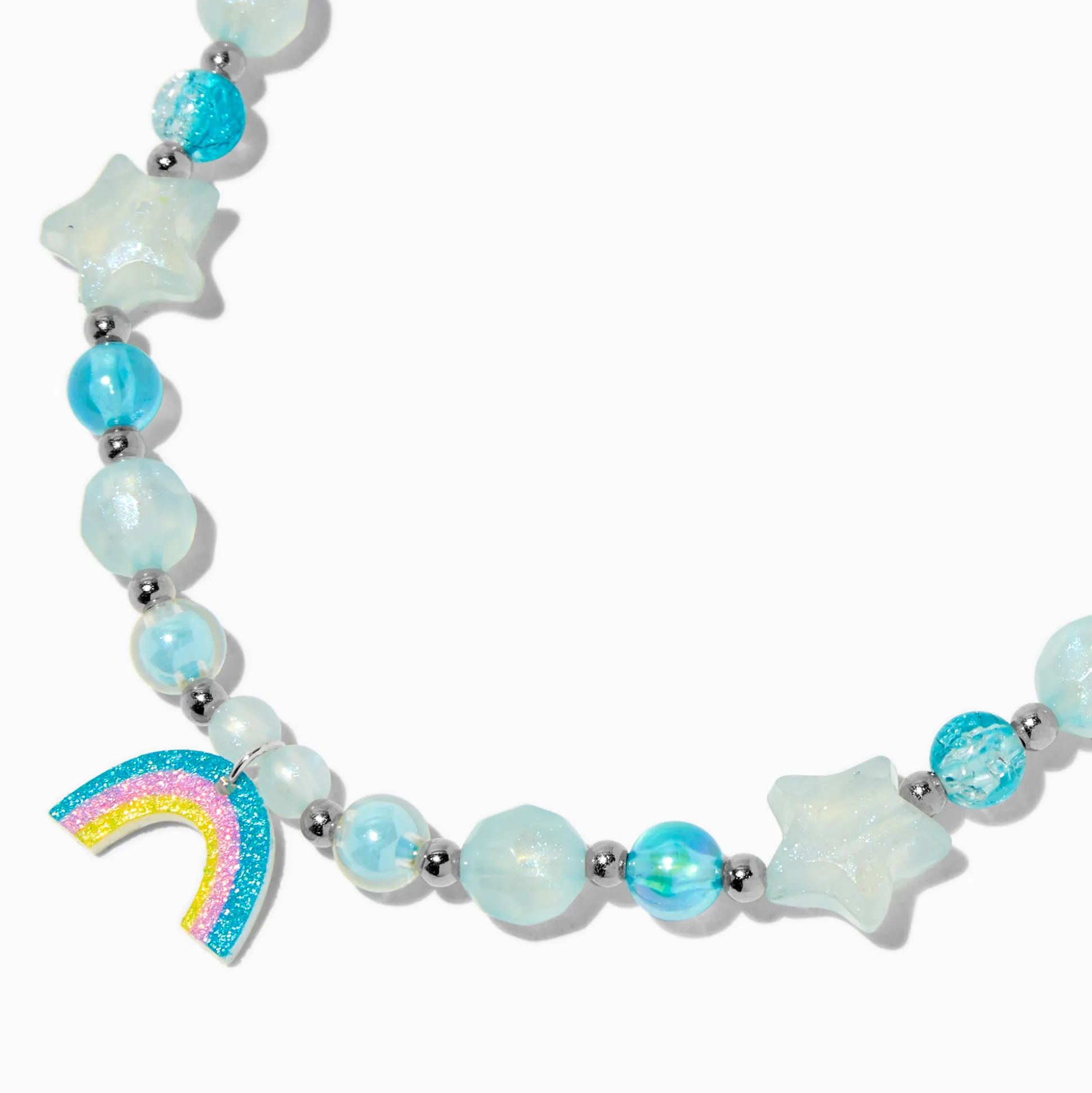She can show off her individuality in this rainbow pendant necklace. This stretch necklace is covered in blue beads in a variety of shapes.