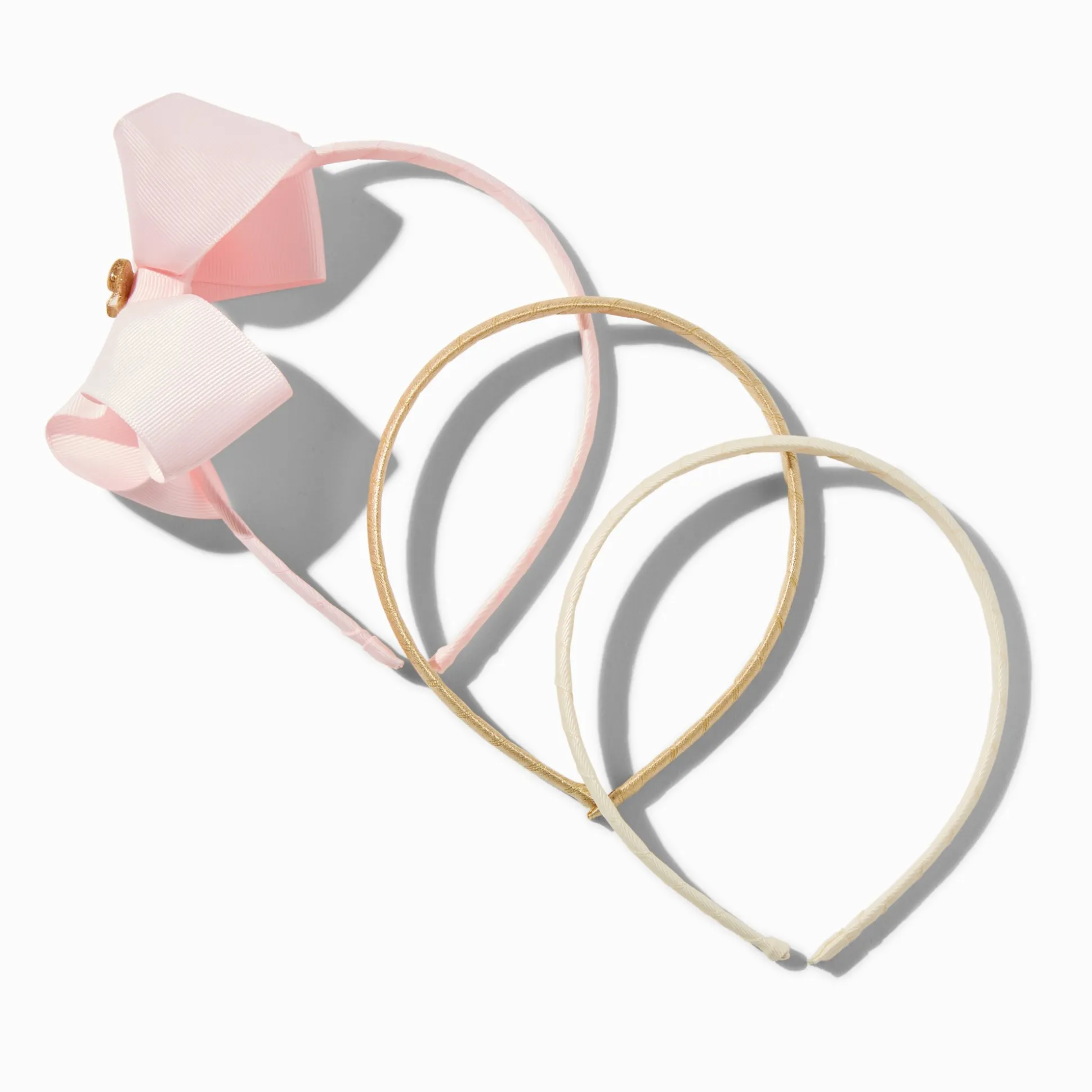 Keep her hair out of her face and eyes with this adorable set of headbands. The set includes a blush pink headband with a coordinating loopy bow and glittery bow charm and two plain headbands in neutral shades.