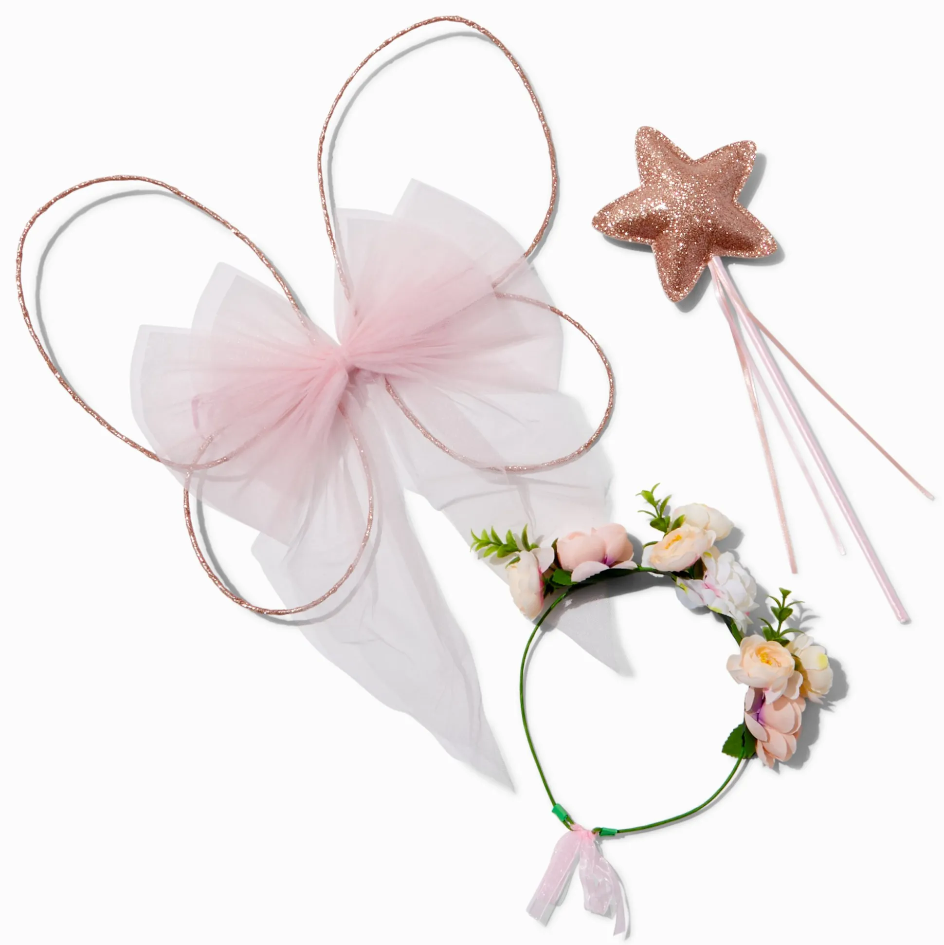 This set is fit for all little bodies! She can don the stretch wings -backpack style-, place the flower crown on her head, and take hold of the wand.. poof! Pretty, pretty princess she has become!