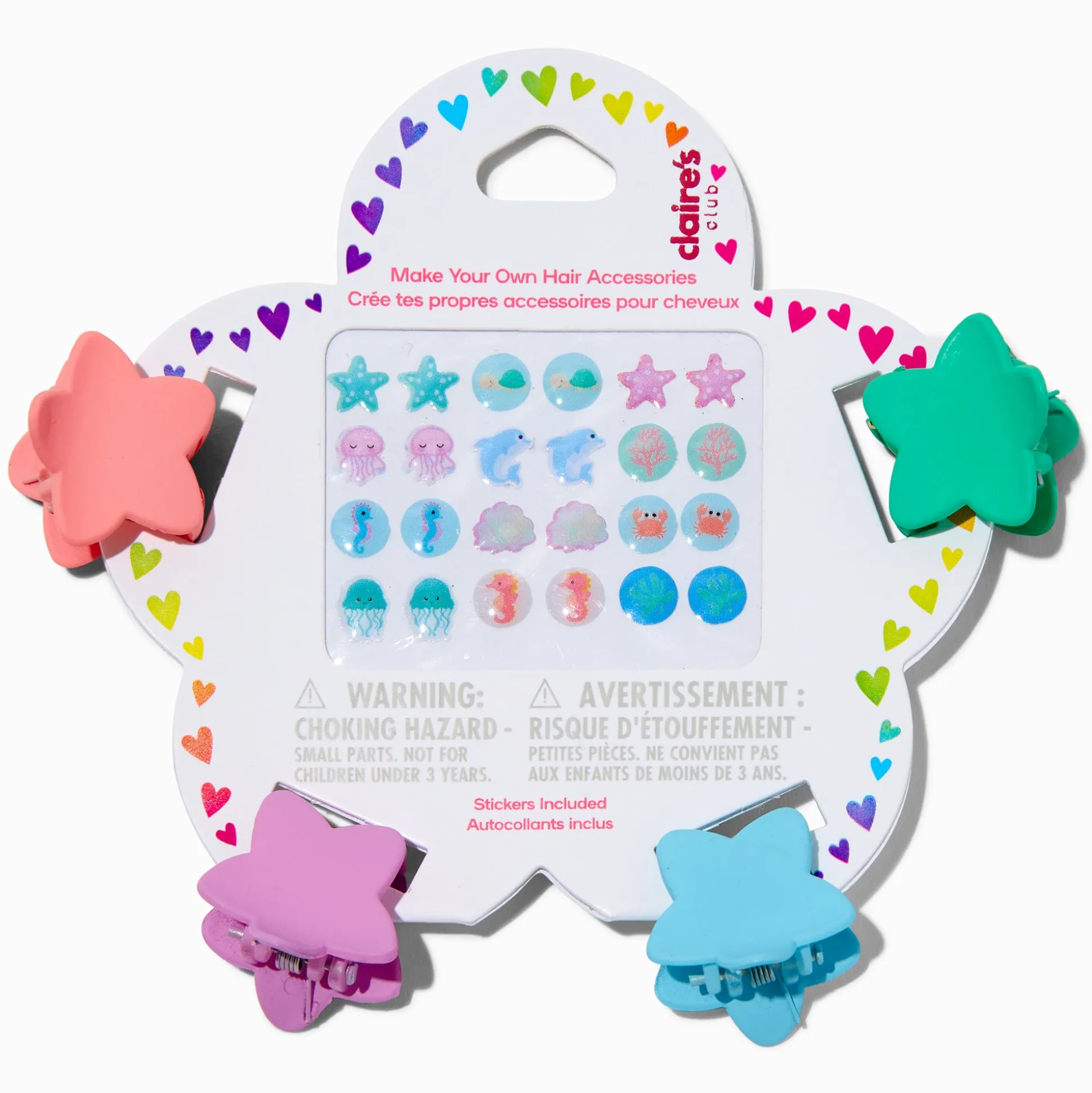 Before she hits the beach or goes on vacation, your little mermaid will love to decorate starfish-shaped hair claws with beach-inspired stickers. Sticker designs include sea turtles, dolphins, coral, octopus, jellyfish, and more.