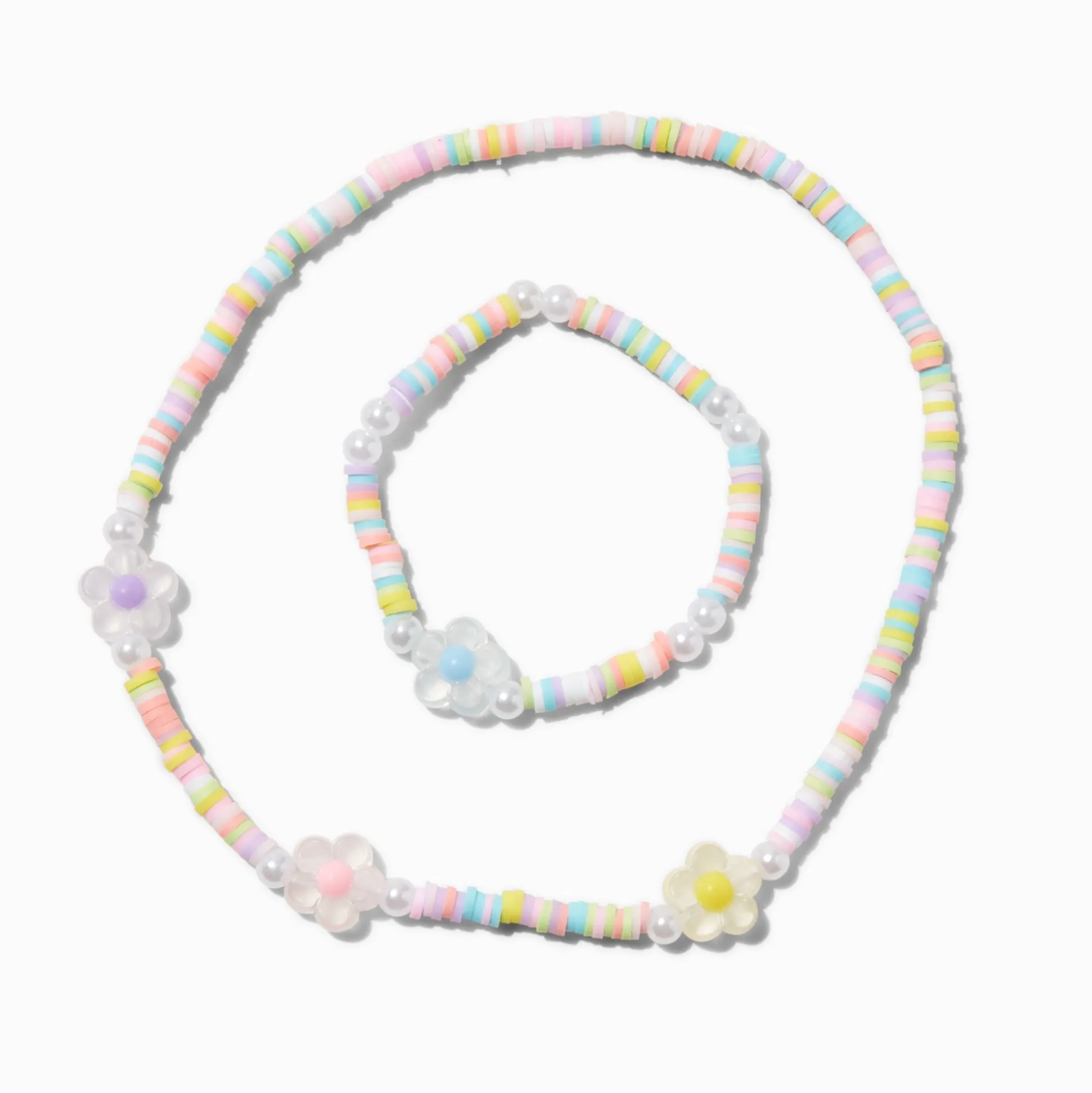 Help her welcome spring with this jewelry set. The necklace and bracelet are both covered in colorful heishi beads and flower-shaped beads.