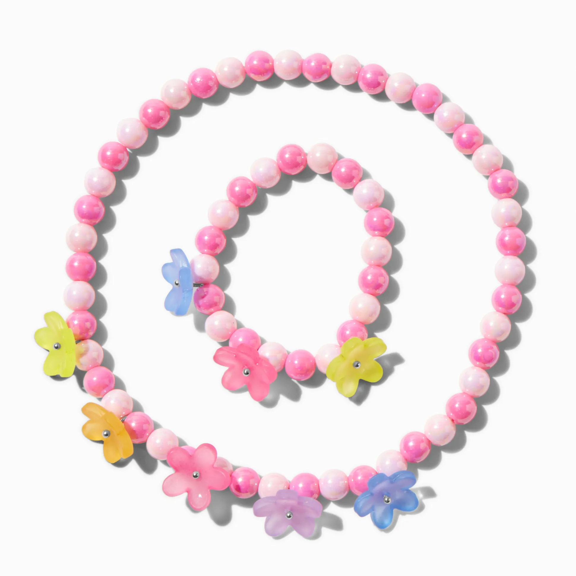 Get her little fingers on this beaded stretch jewelry set! Let her true colors shine with a stretch bracelet & necklace that houses pastel beads and matching floral charms.