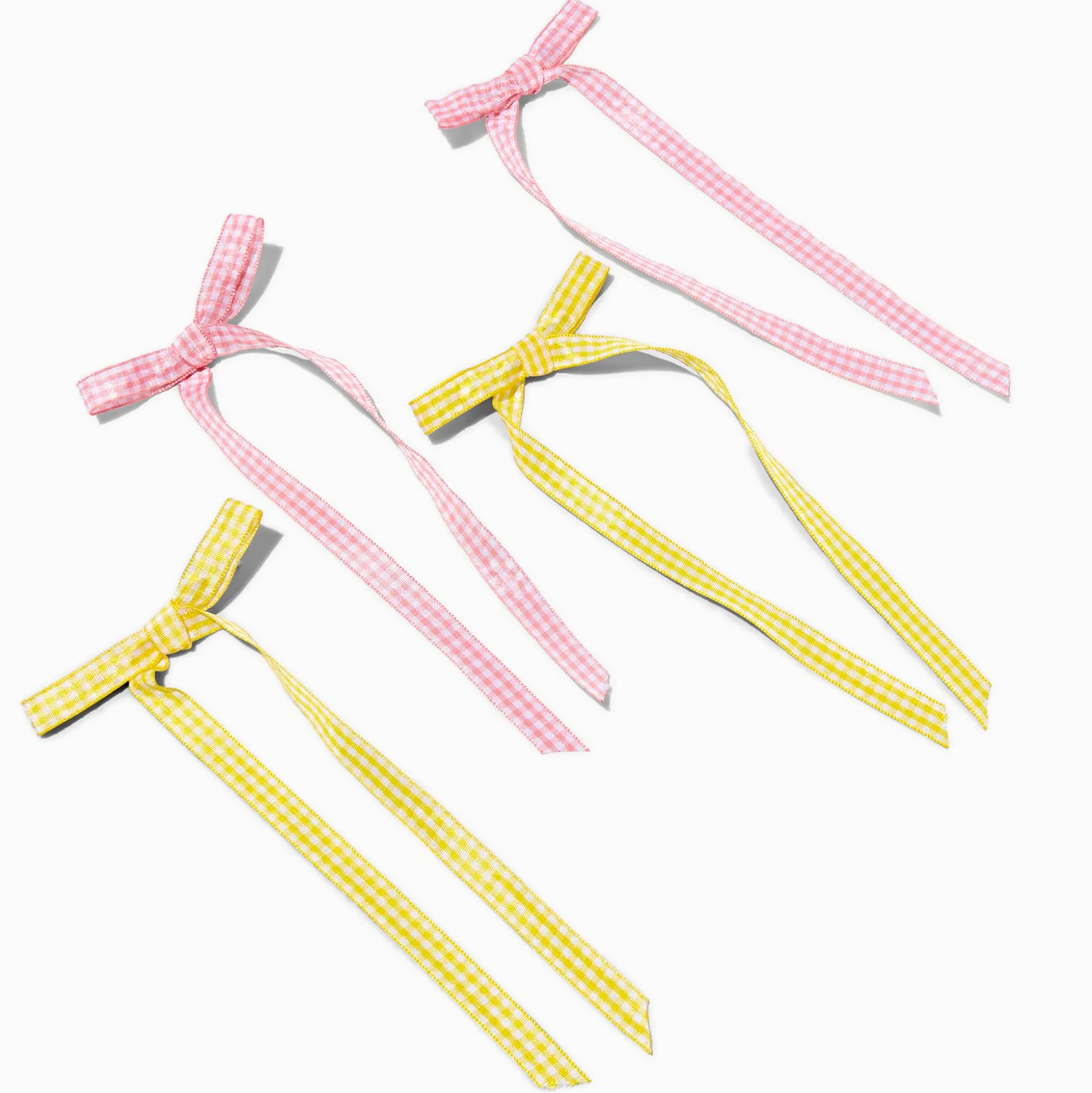 Decorate her hair for warm weather with these adorable gingham hair bows. The four-pack set includes pink and yellow hair bows with long tails.